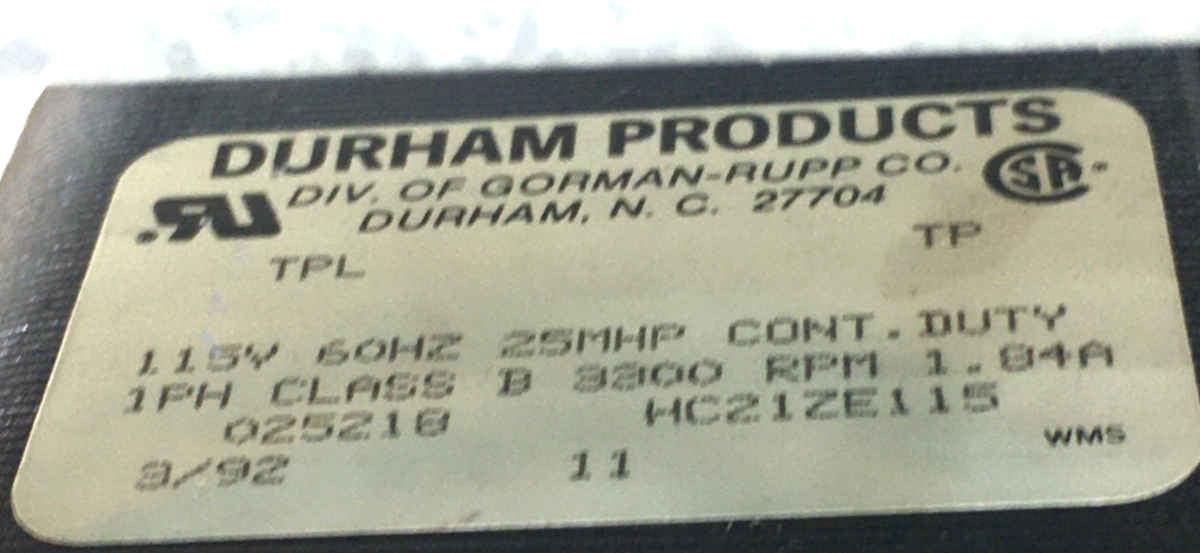 DURHAM Furnace Exhaust Inducer Motor 025218 HC21ZE115 115V 3300 RPM used MG75A