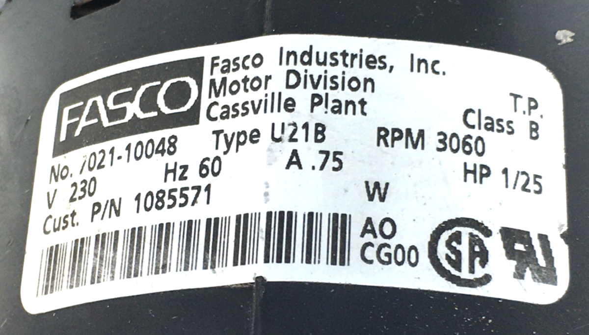 This is FASCO 7021-10048 Draft Inducer Blower Motor 1085571 230V 1/25 HP 3060 RPM used part.
