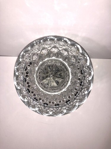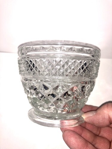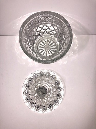 The Vintage Anchor Hocking Wexford Footed Cover Sugar Bowl Candy Dish is a collectible kitchen piece that is perfect for displaying sugar or candies. This round glass dish stands at 5 inches tall with a clear Wexford pattern, making it an American vintage treasure from the Anchor Hocking brand. The set includes a lid, adding a unique touch to the classic design. Made in the United States, this original piece is a must-have for collectors of vintage dinnerware and serveware.