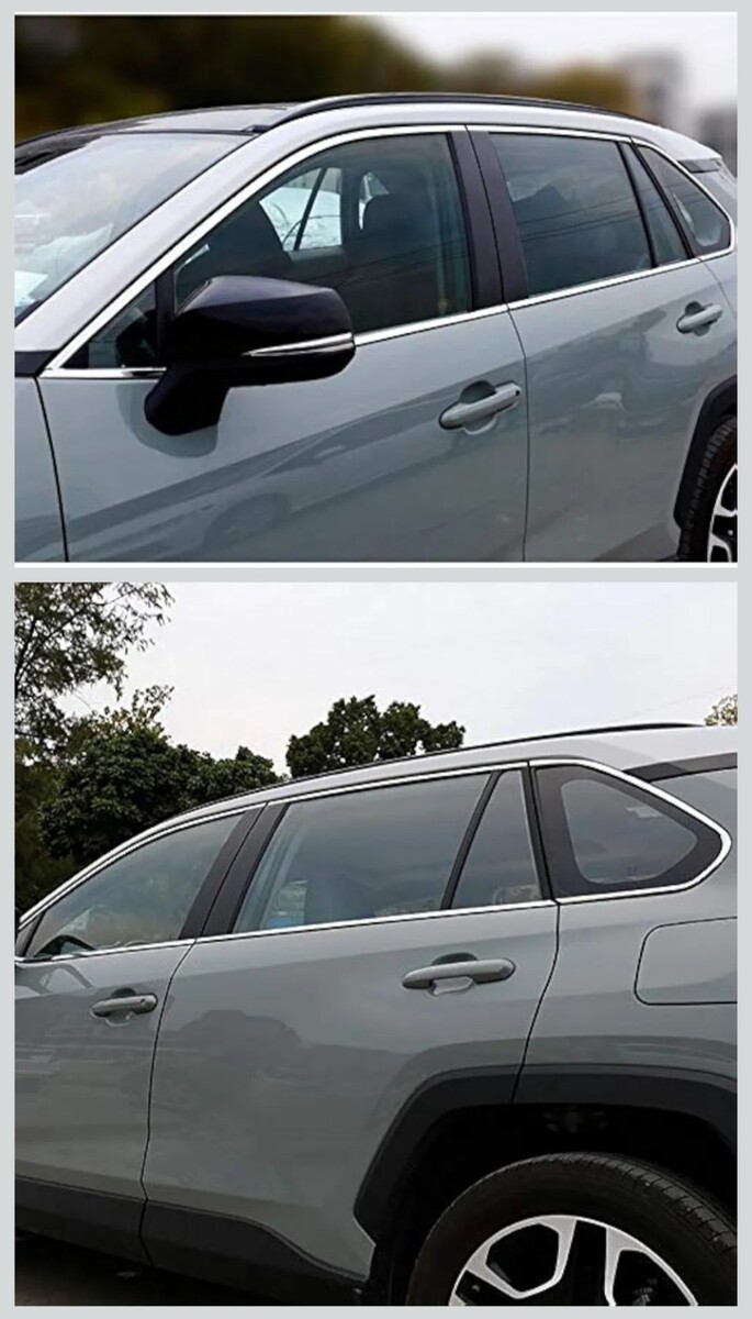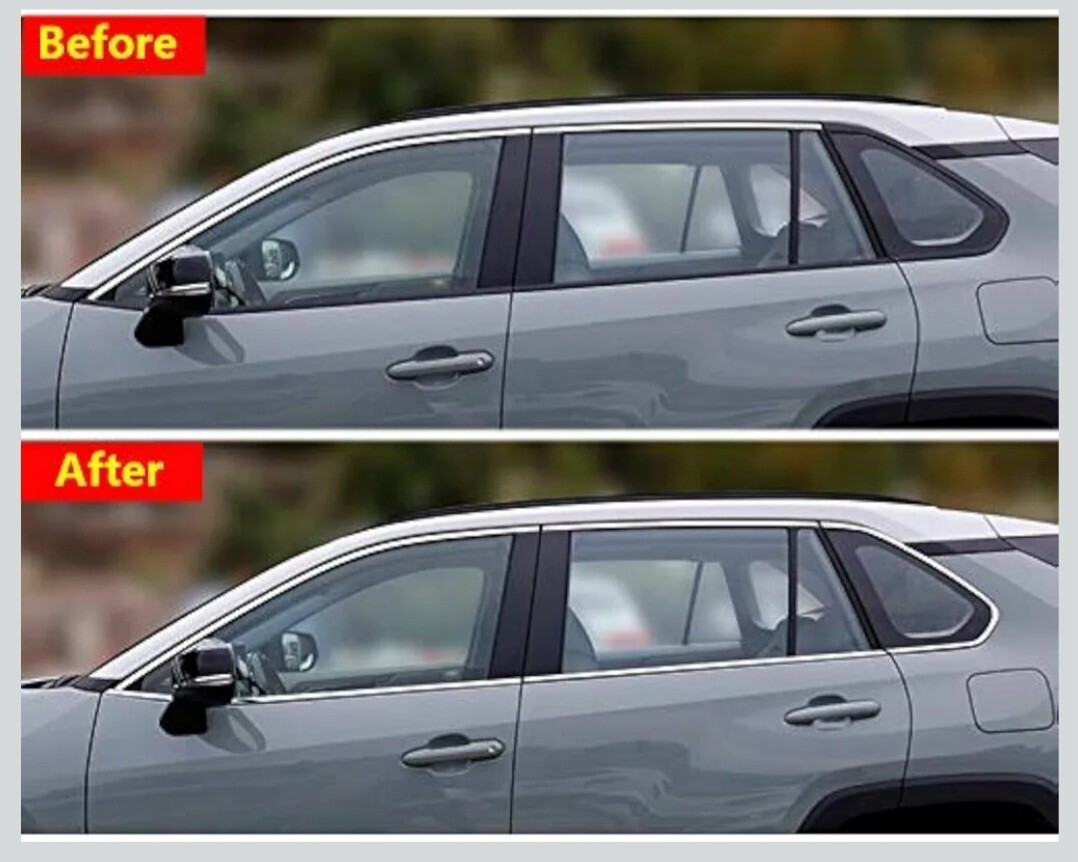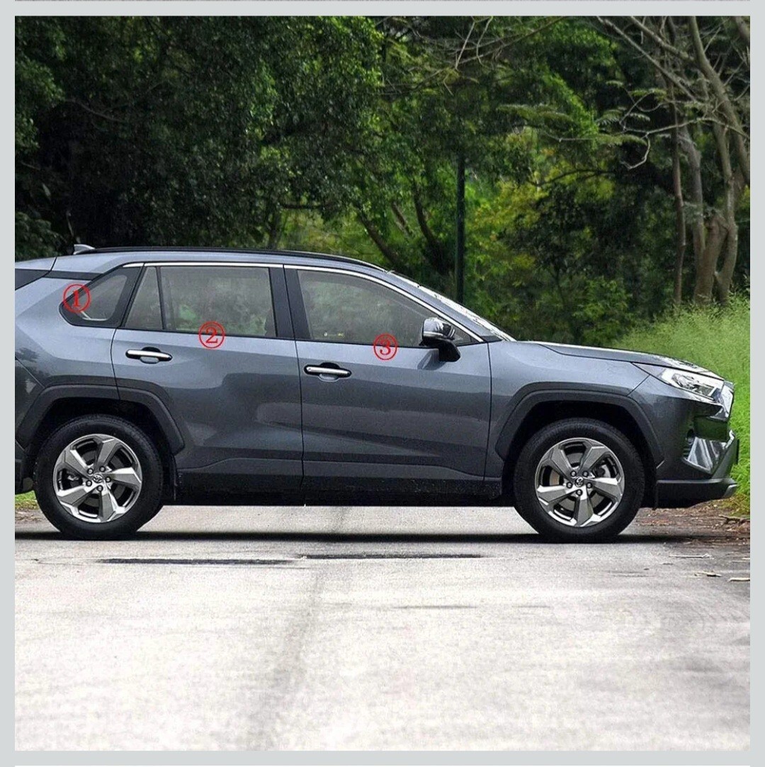 The product is a set of window pillar post trims specifically designed for Toyota RAV4 models from 2019 to 2025. These trims are designed to enhance the exterior of the vehicle by adding a sleek and polished look to the window pillar posts. Made with high-quality materials, these trims are durable and designed to fit seamlessly onto the vehicle's window pillars, providing a stylish and personalized touch to the overall aesthetic of the Toyota RAV4.