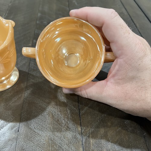 This bowl set is perfect for any occasion and is sure to impress guests. Use it to serve sugar and cream with your coffee or tea, or simply display it on a shelf. It's a unique piece of decorative cookware that will add charm to any kitchen. Don't miss out on the opportunity to own this vintage Fire King Oven Ware Peach Luster Laurel Leaf Cream and Sugar Bowl Set.