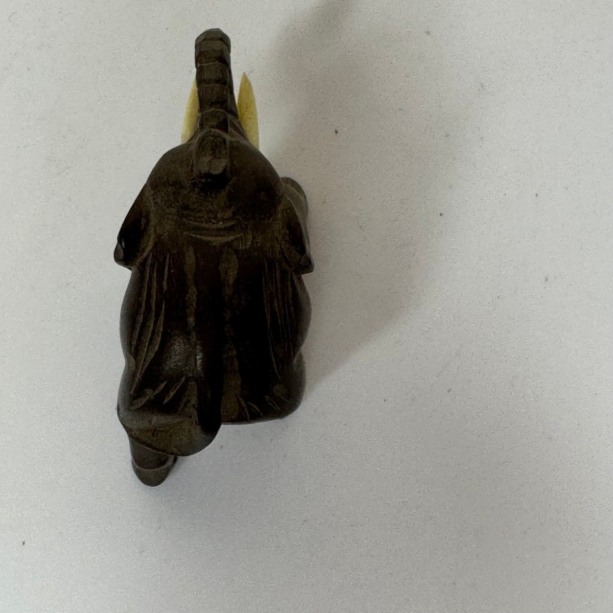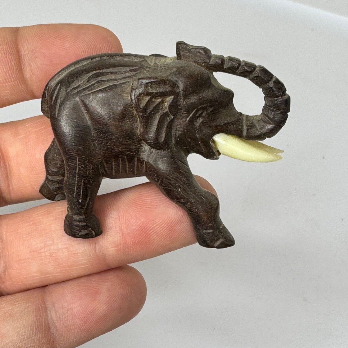 Keywords: carved elephant, wood carving, ivory tusks, animal decor, desk accessory, shelf sitter, souvenir, collectible, handcrafted, tribal art, folk art, miniature, unique gift