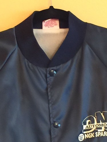 This new without tag promotional varsity jacket is in excellent condition as it has never been worn! A promotional jacket for DNS Automotive NGK Spark Plug. Size Medium. Dark Blue color. The jacket features snap buttons and two front slash pockets.