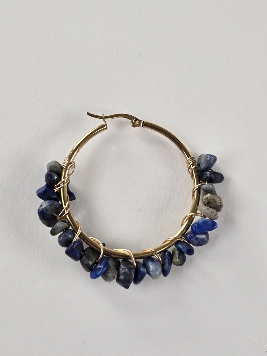 These Wire Wrapped Gemstone Hoop Earrings by Edna Catherine are a bold statement piece of jewelry featuring a stunning blue lapis lazuli crystal set in yellow gold plated metal. The leverback closure makes them easy to put on and take off, while the nickel-free material ensures safe wear for sensitive ears. The round shape and hoop style add a touch of elegance to any outfit, making them a versatile and stylish accessory for women who want to make a statement with their jewelry. Perfect for those who appreciate beauty, nature, and a bohemian or celestial theme in their fashion choices.
