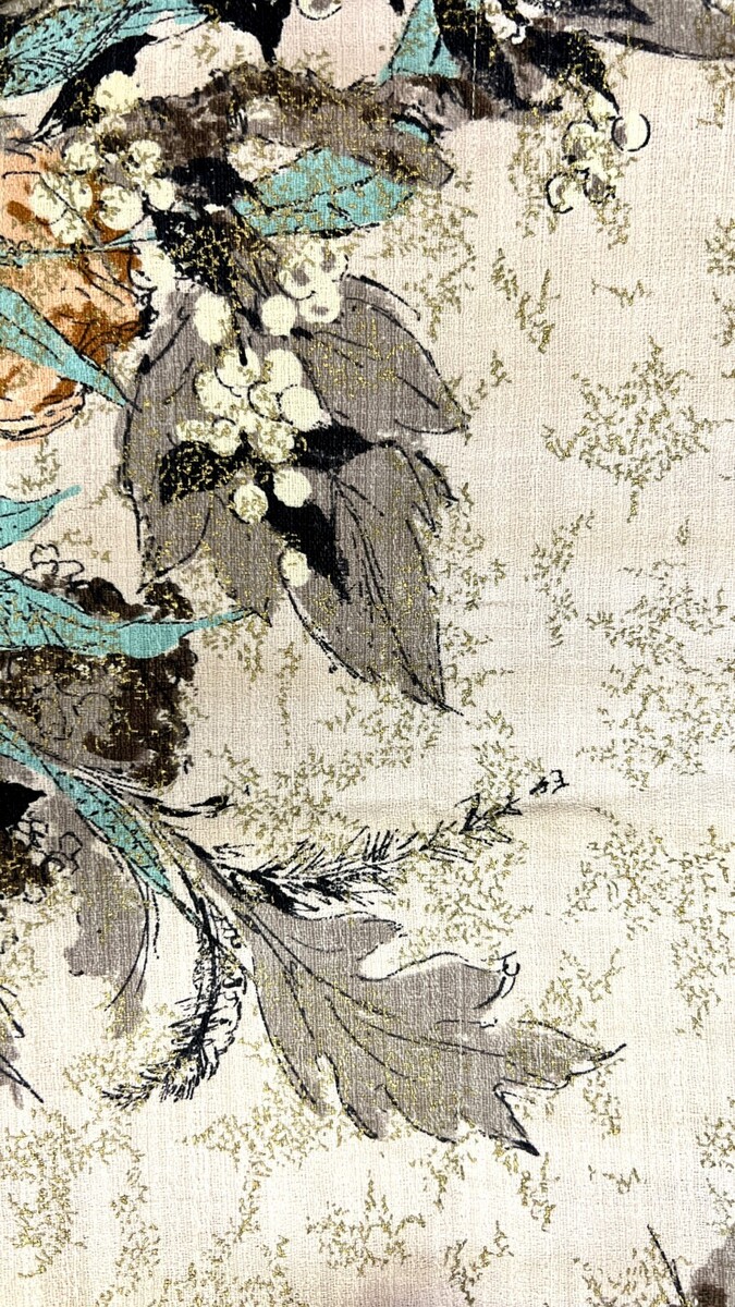 The print is in tones turquoise, peachy pink, black and gray, with metallic gold accents all over the warm beige background.