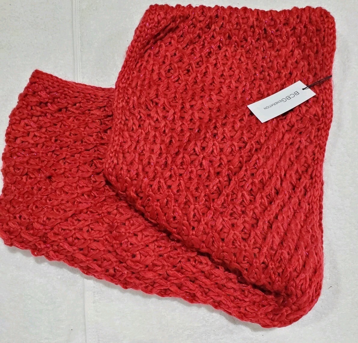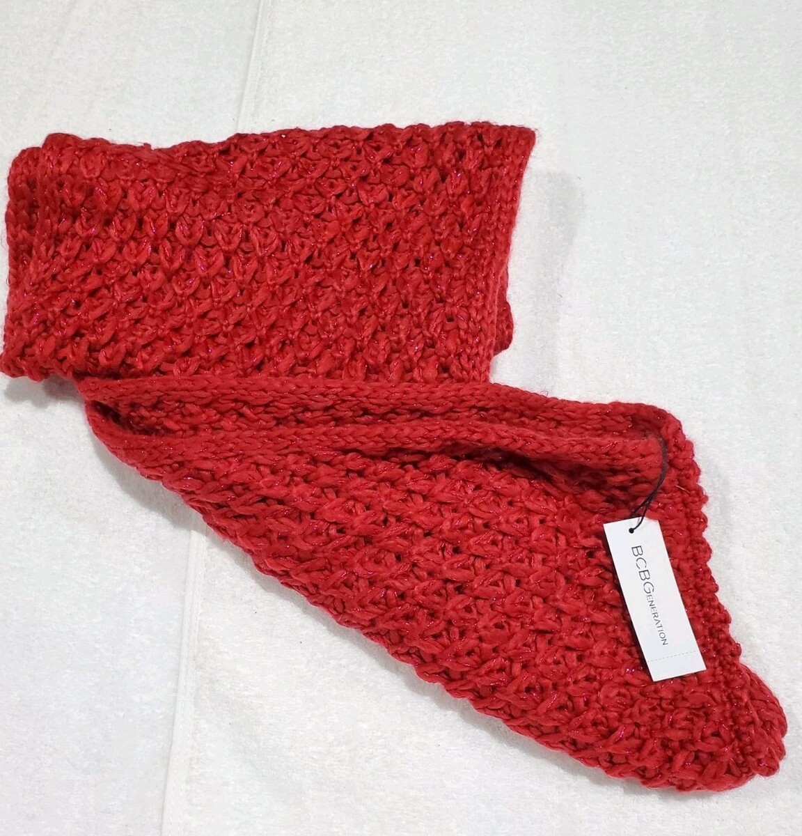 The BCB Generation Red Infinity Scarf with Tucked Switch Loop is a stylish and versatile accessory for women. Made from a blend of polyester and acrylic, this knit scarf features a solid red color with a unique tuck stitch design. The infinity shape and 28" length make it perfect for winter and fall seasons, adding a colorful and cozy touch to any outfit. Hand wash only to maintain its quality, this scarf is a trendy and fashionable choice from the BCBGeneration brand.