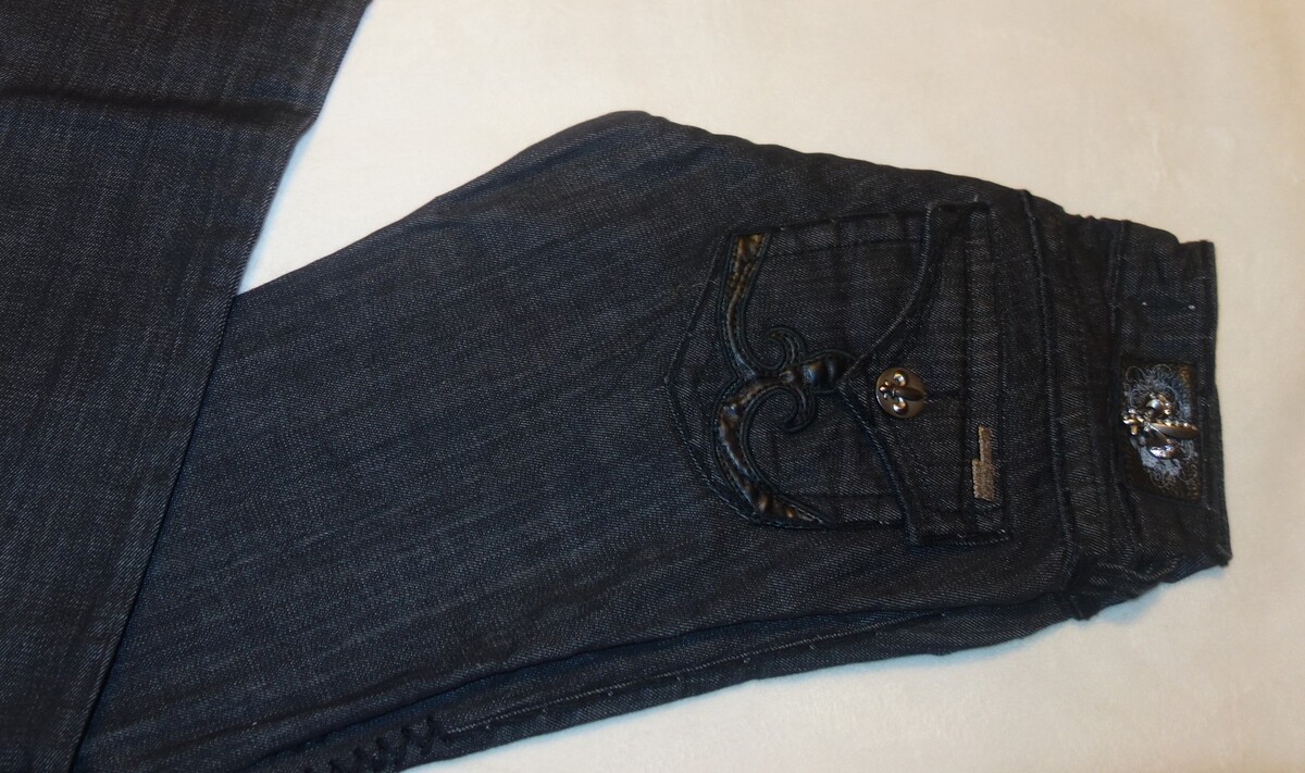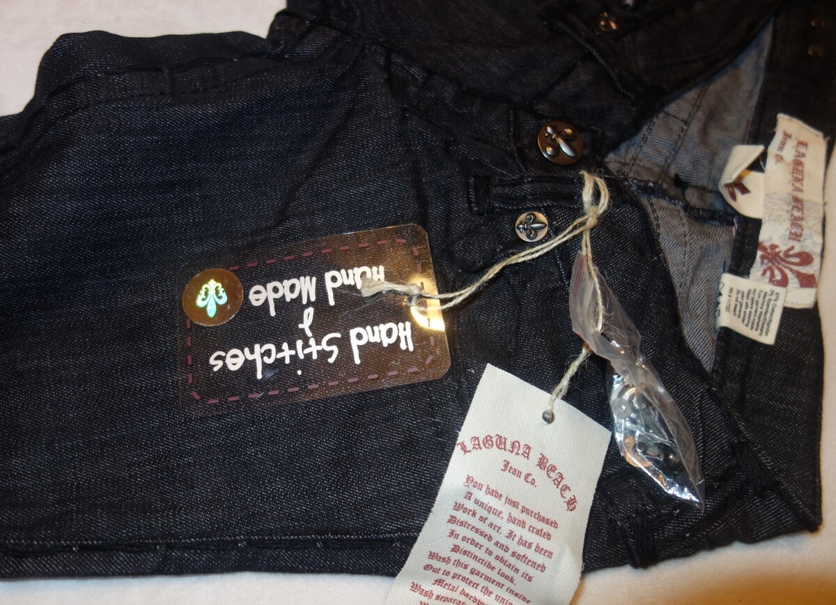 Tonal stitching and back flap pockets highlight this pair of straight-leg jeans from Laguna Beach. These women's jeans feature a stylish black wash and a touch of spandex for ease of movement. custom Fleur De Lis buttons, grommets ,Crystal Accent , and leather inserts on back pockets. Also note the thick hand made thread stitching on the seams and pockets that give these pants texture and depth!