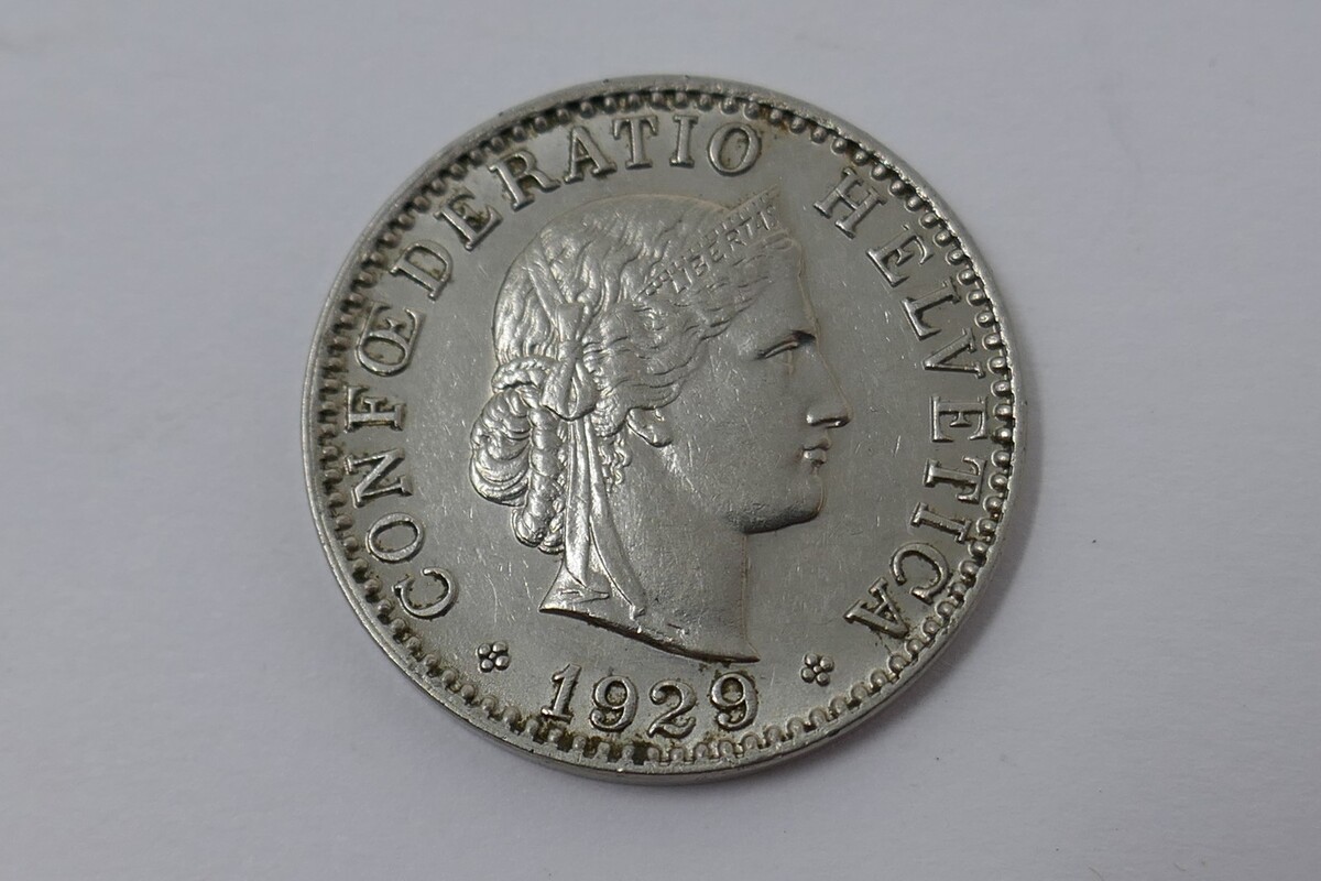 This is a Helvetica 20 Rappen Libertas Nickel coin. This coin was minted in Switzerland in 1929 and is composed of nickel. It features the face value of 20 Rappen and is uncertified.