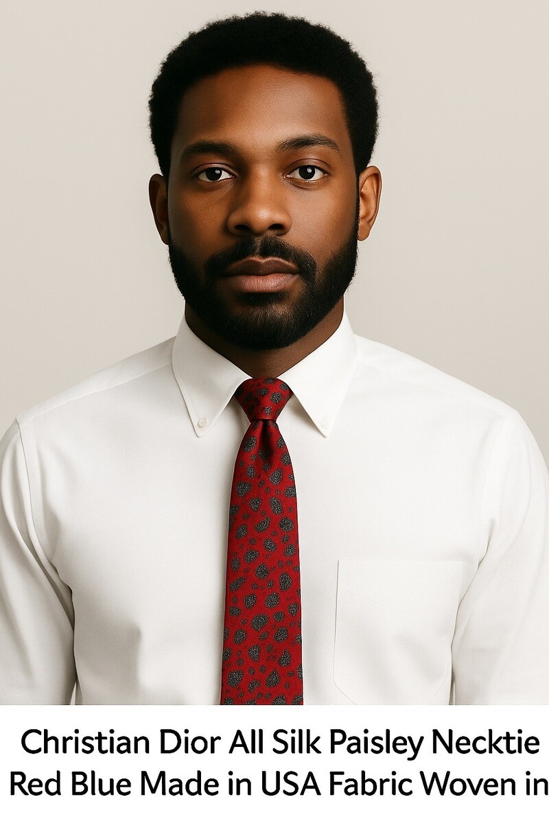 Christian Dior All Silk Paisley Necktie Red Blue Made in USA Fabric Woven in Italy