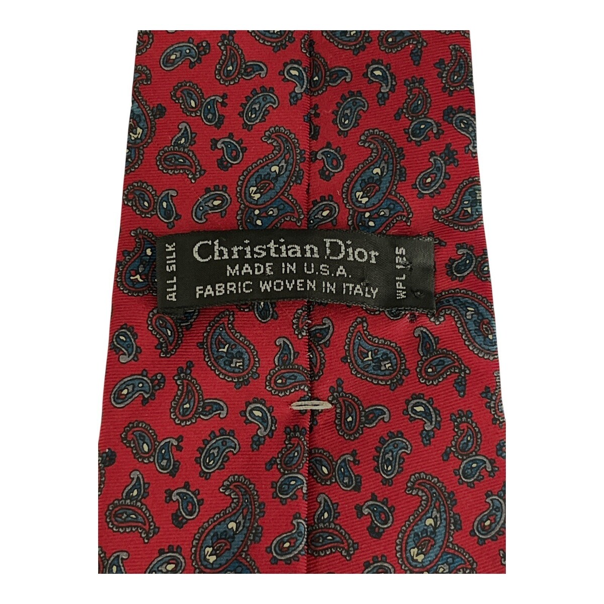 Classic Christian Dior men?s necktie featuring a red background with an intricate blue and gold paisley pattern. Crafted from 100% silk, this elegant tie was made in the U.S.A. with fabric woven in Italy. A timeless accessory suitable for business, formal, or vintage fashion wear.