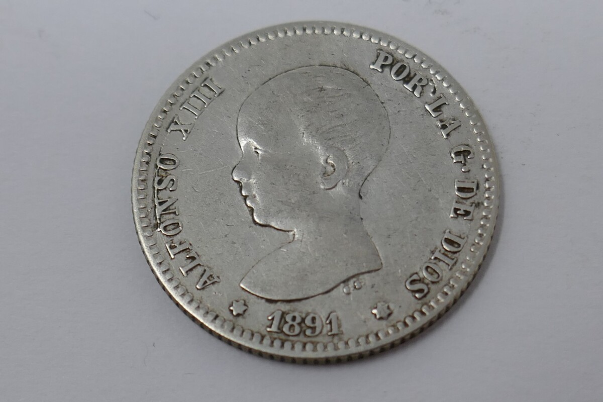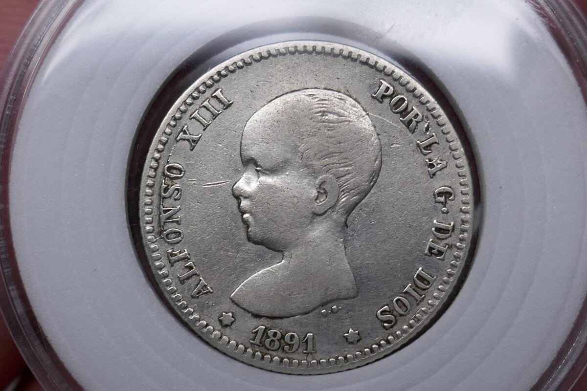 Spain 1891 Alfonso XIII 1st Portrait 1 One Peseta Silver Coin