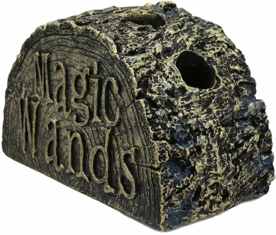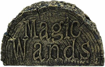 ? In museum-grade resin, this cool wand stand looks like a slice of tree bark with 4 holes radiating along the top and Magic Wands emblazoned on the front. The holes are sized to hold many wood or resin wands and also beautifully holds your favorite pens - words are magic after all.