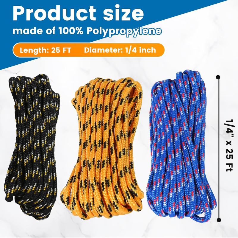 Pack Includes (3) 1/4" x 25' Diamond Braided Rope. 95 lb. working load limit