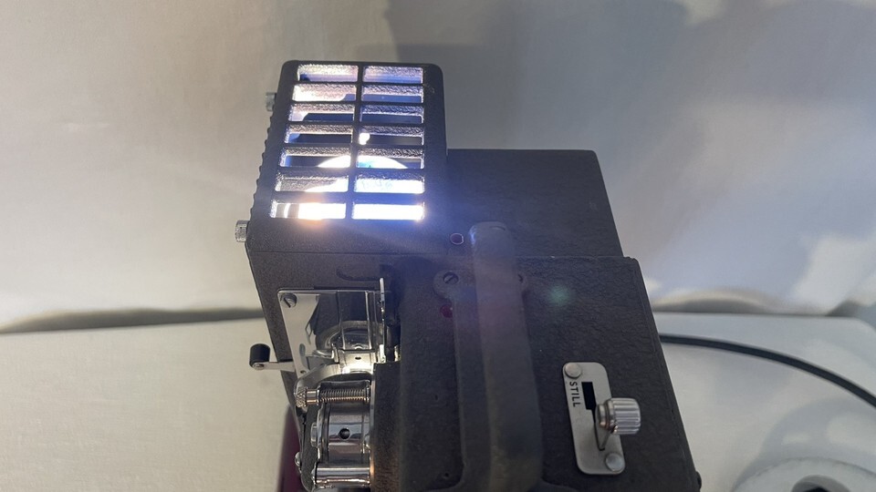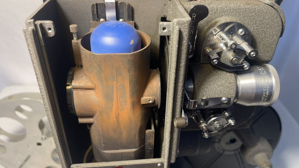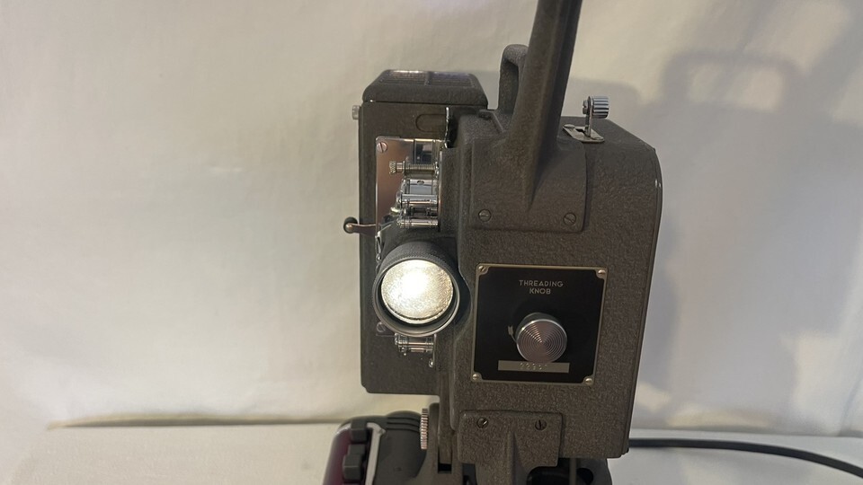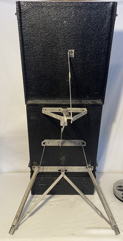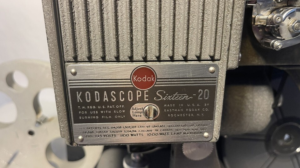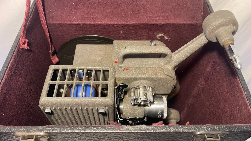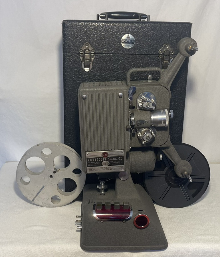 The vintage Kodascope Sixteen 20 movie projector was manufactured by Kodak in the United States in 1940. It is designed for 16mm movie film format and comes with a Kodak case. Ideal for vintage movie enthusiasts looking to experience classic film projection.