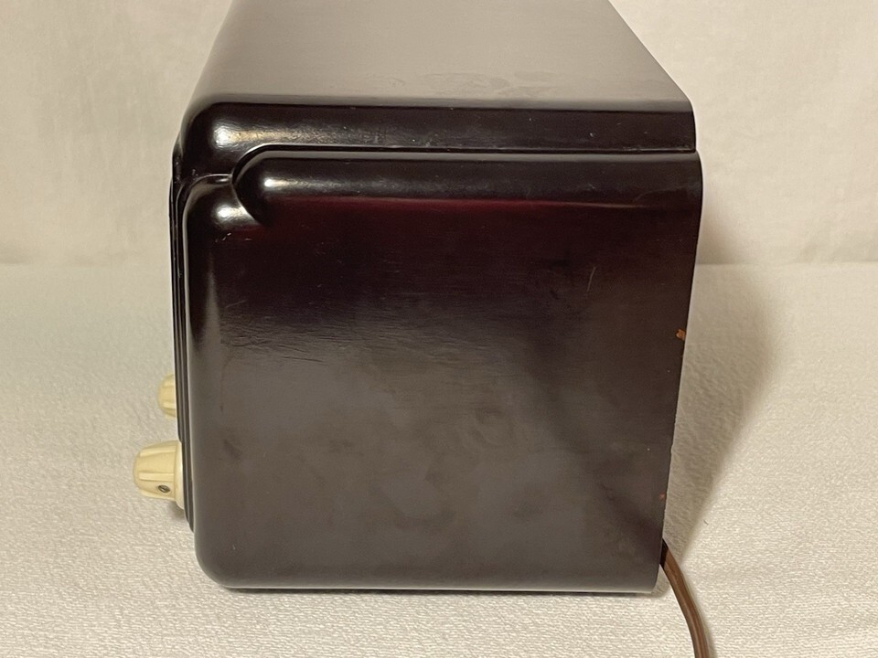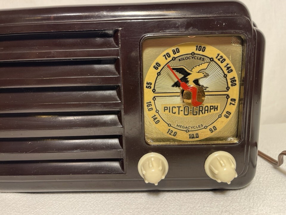 The product is a rare and original Kilocycles Picto-Graph Megacycles Tube Radio in a brown color. This antique-style radio is made of a combination of wood and metal, giving it a unique and vintage look. With its working condition, this radio is sure to be a prized collector's item for those who appreciate historical electronics.
