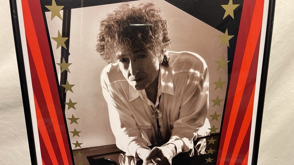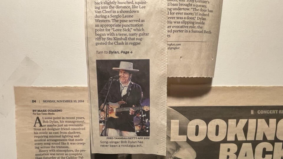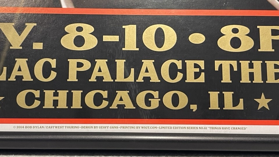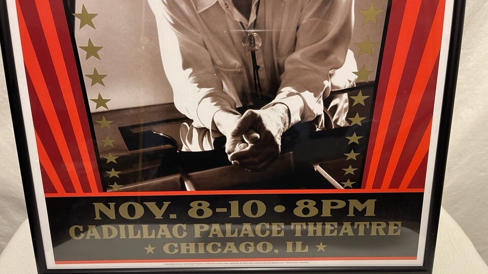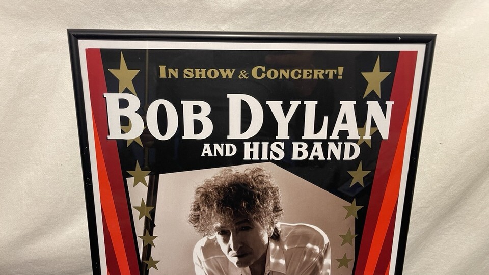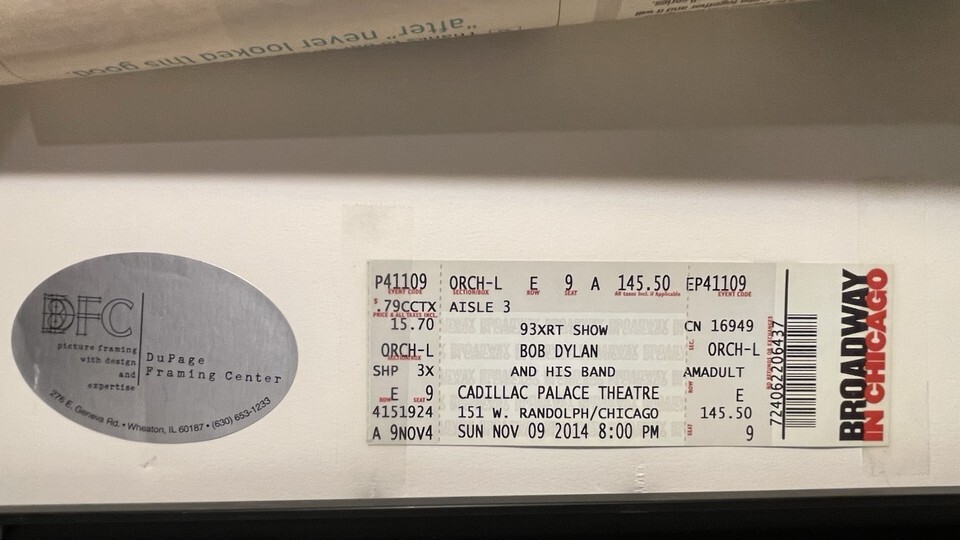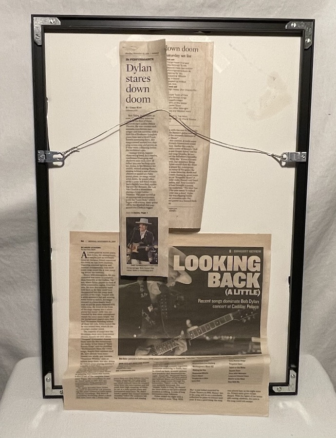 This is a framed concert poster/ticket and newspapers featuring Bob Dylan and his band from November 8-10, 2014. The poster is an original piece of music memorabilia. It is a great collectible item for fans of Bob Dylan and rock/pop music.