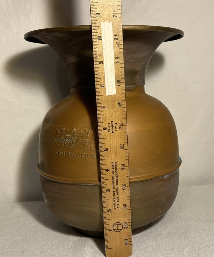 Antique BRASS SPITTOON "UNION PACIFIC R.R." Double-Sided EMBOSSED RAILROAD LOGOS