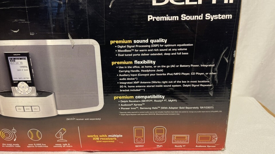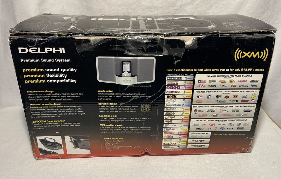 Enjoy premium sound quality with the Delphi SA10221 Radio XM Satellite. This portable stereo and boombox is perfect for satellite radio enthusiasts who want to enjoy their favorite tunes on-the-go. With its sleek silver design, this Delphi model is sure to turn heads and add a touch of style to any setting.