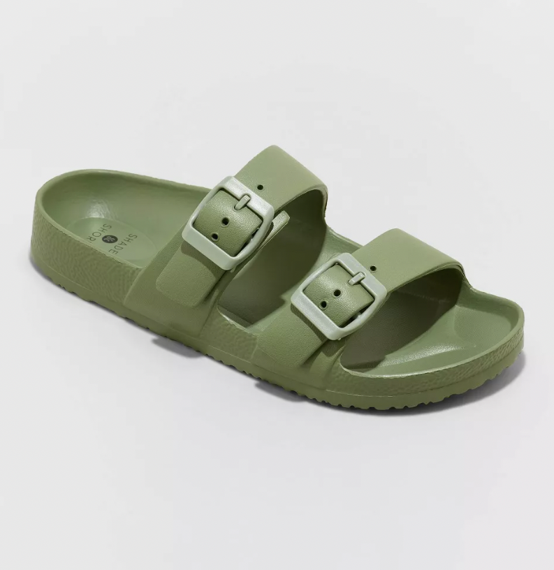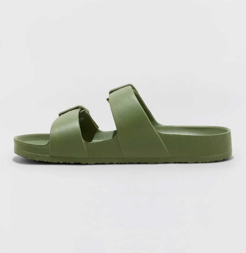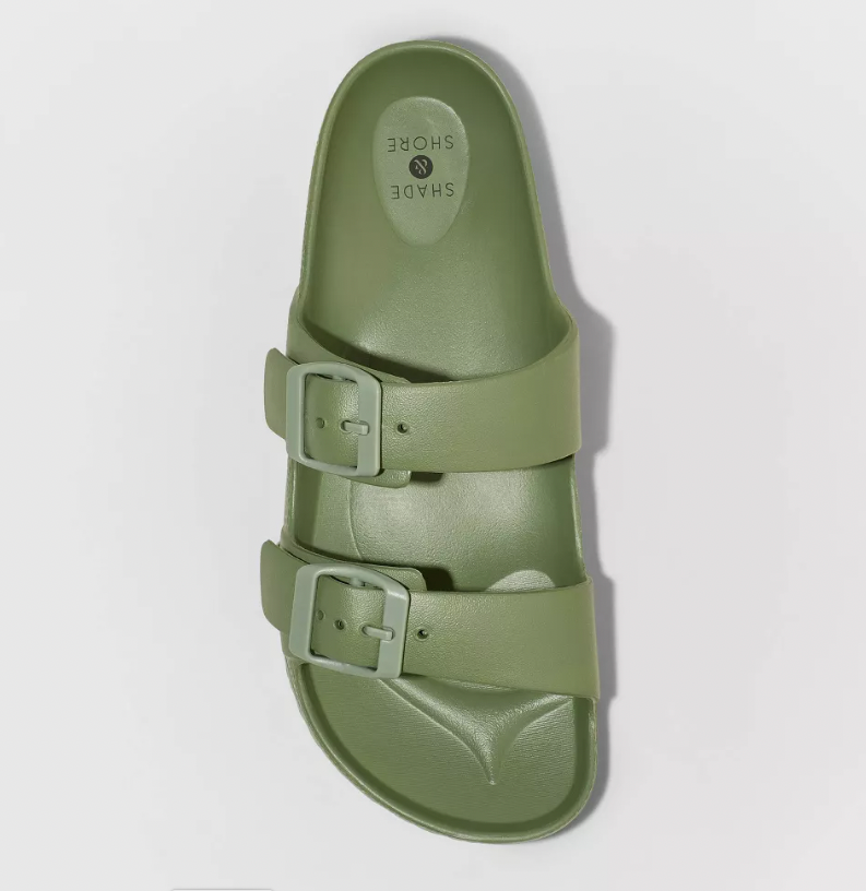 This is for a brand new with tags pair of Shade Shore Womens Neida EVA Two Band Footbed Slide Sandals in Olive Green Size 6 US Plastic construction with allover single color for a sharp look Great for gardening, errands or simply hanging in your yard Update your summer wardrobe with the cool and casual look of these comfy Neida EVA Two-Band Slide Sandals from Shade Shore. These simple yet stylish slip-on sandals feature 100% plastic construction for a squishy feel underfoot and a surface that easily wipes clean. Great for wearing in your garden, on your deck or even to the pool, these open-toe sandals feature a double band on top with two buckles, all in a single color for a chic twist on a classic design. Footwear Insole Material: 100% EVA (Ethylene Vinyl Acetate) Footwear Outsole Mat