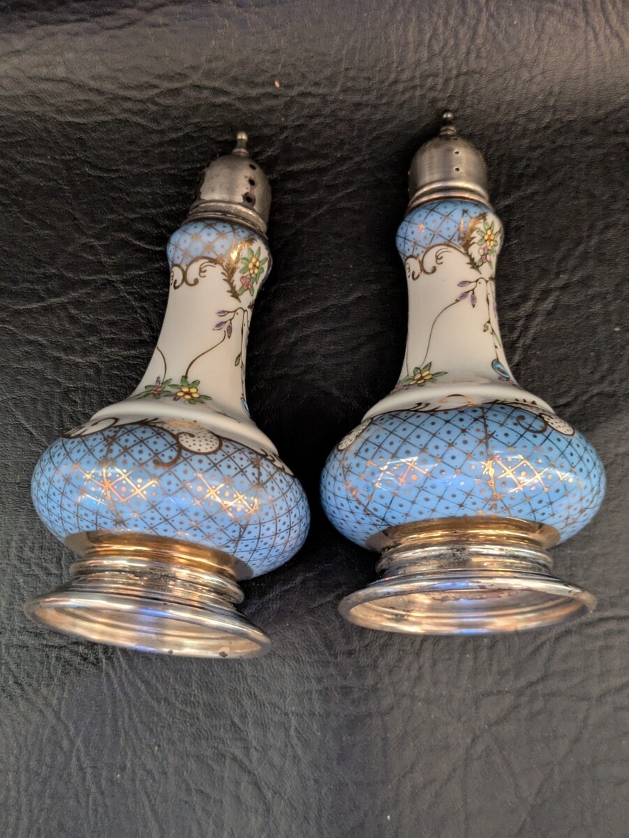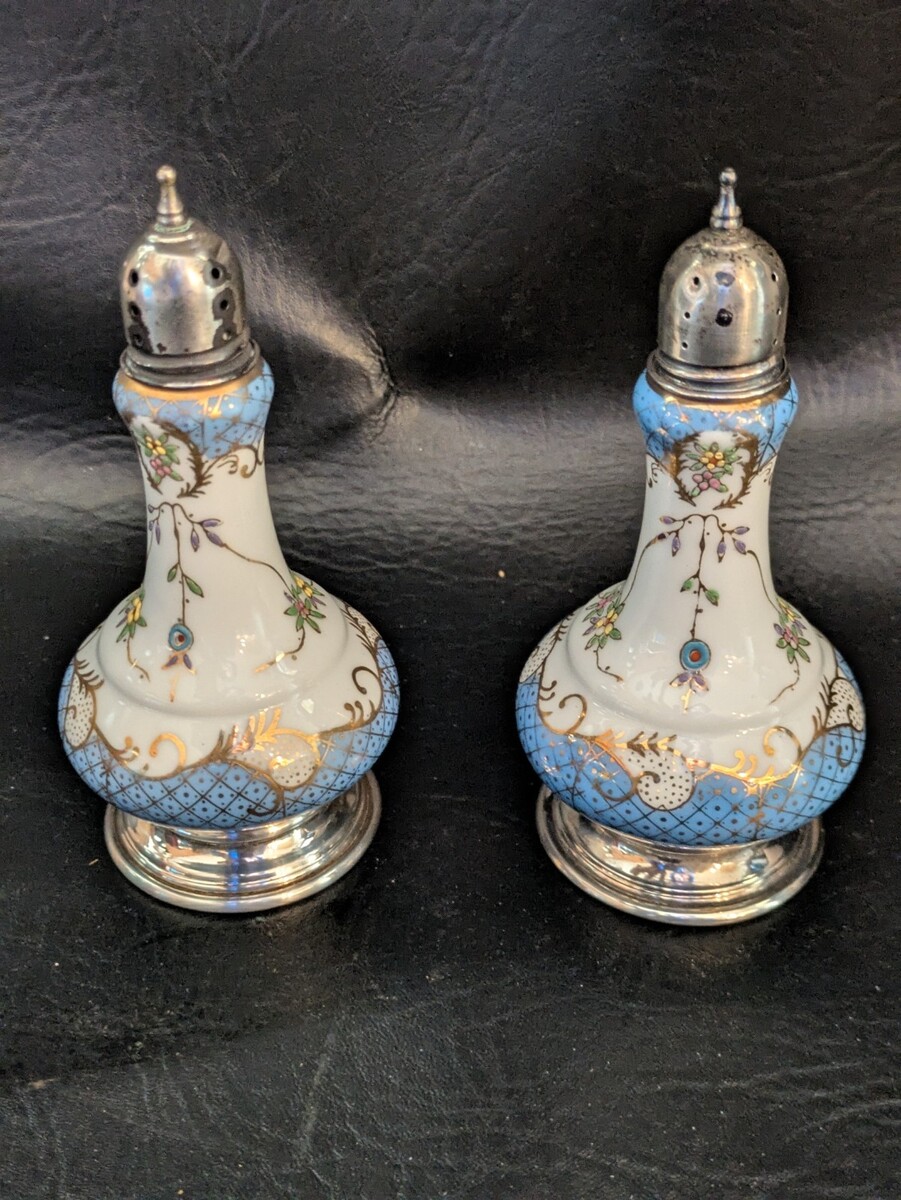 Ancien Orné Porcelaine Chine Sel Et Poivrières Argent Sterling Couvercle Base