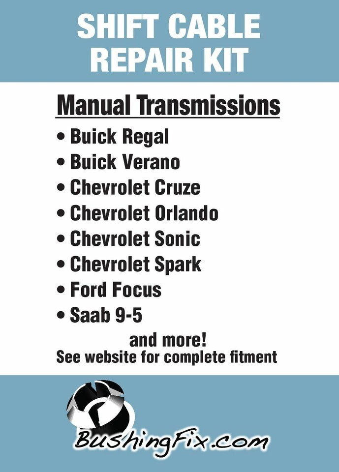 Chevrolet Spark Ca1Kit (US patent #10,619,723 and #10,215,273) allows you to quickly and easily repair your manual transmission shift cables by replacing the bushing in each cable. The patented coupling and custom molded replacement bushings ensure a quality repair with ease. A professional can perform this repair in under 5 minutes, average time for a non-professional is less than 10 minutes. This bushings are made from a material that was designed to outlast the factory bushings and includes an installation guide. Bushing Fix CA1KIT?- Transmission Shift Cable Bushing Repair Kit ?; (US Patent # 10,215,273 and US Patent # 10,619,723).