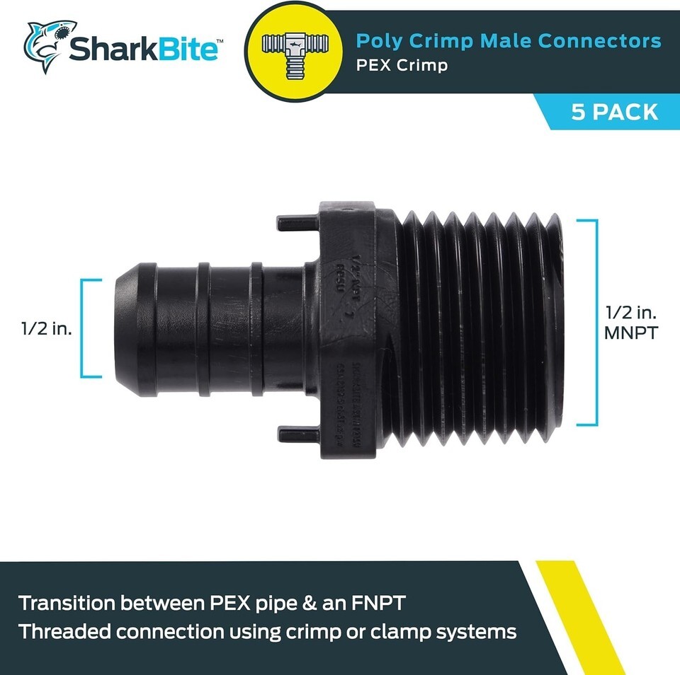 The SharkBite UP120A5 Male Adapter enables a secure, code-compliant transition from 1/2-inch PEX tubing to a 1/2-inch male pipe thread (MPT) connection?ideal for linking PEX supply lines to faucets, valves, shower mixers, or hydronic manifolds. Made from lead-free poly alloy, it features a barbed end for crimp or clamp-style PEX attachment and a precision-machined MPT end for reliable threaded sealing. Rated for 160 psi and 200F, it?s certified for potable water and hydronic heating systems, offering long-term corrosion resistance without galvanic concerns.