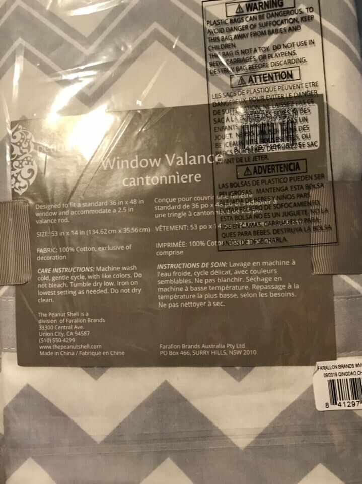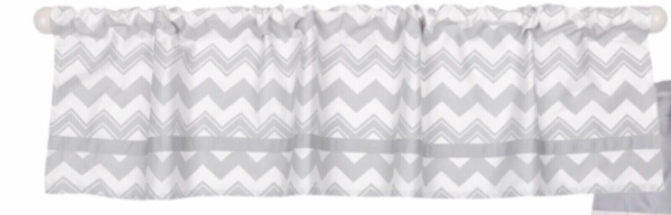 The Peanut Shell Window Valance features a tailored rod pocket design in a grey chevron print with grey trim. Valance measures 53 inches wide with a 14 inch drop. The 3 inch rod pocket accommodates a rod up to 2.5 inches in diameter. 100% Cotton Sateen. Coordinating accessories available from The Peanut Shell to create your perfect room.