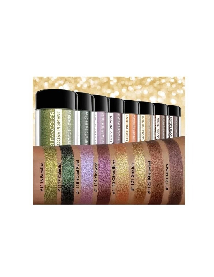 Kleancolor makes a Loose Highly Pigmented Eyeshadow that comes in 8 bold autumn foil and chrome finishes. For multi use and easily blendable. Each comes in a jar with a removable shaker cover that controls the amount of pigment dispensed.
