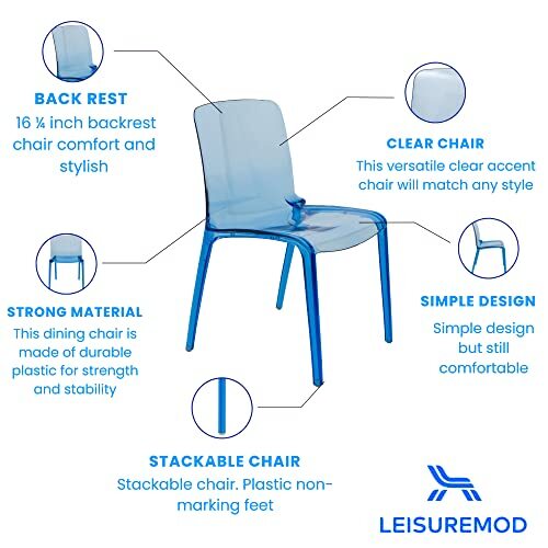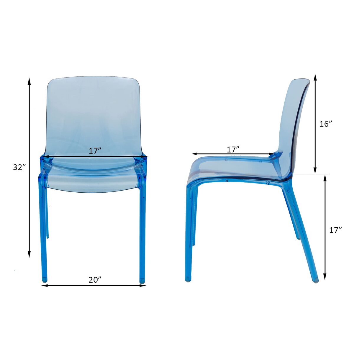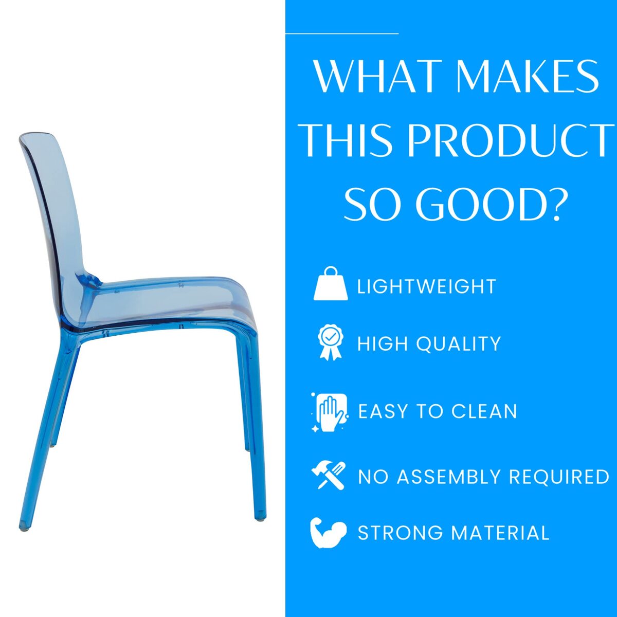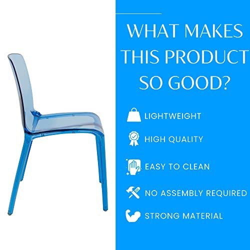 Product description: This sleek chair adds mod appeal to any seating ensemble, you?ll be stuck in a daze by its clean modern design every time you walk by. The clear style of the Dining Chair is extremely versatile and works like a dream with essentially every dining table. Made of clear Plastic; the Dining Chair has a sturdy frame, with a chic design. It is conveniently stackable for when you need to put it in storage or just sweep the floor. It is ideal around a minimalist dining table or simply as a standalone chair in an entryway, hallway or bedroom.