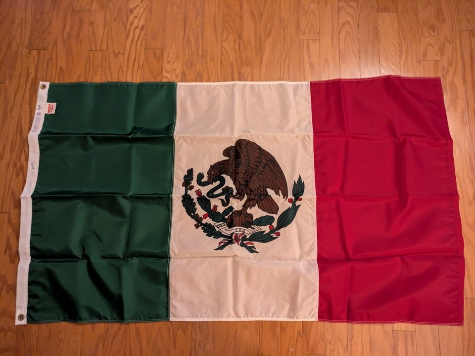 Le drapeau national vintage en nylon Dura-Lite du Mexique mesure 3 x 5 pieds et est fabrique aux Etats-Unis par Dettra Flag USA. Il est livre neuf dans sa boîte.