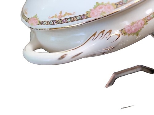 This antique serving bowl by Mercer features a beautiful floral pattern on a white and gold color scheme. The oval shape and round covered design make it a unique addition to any dinnerware collection. Made of ceramic and porcelain, this piece is from the early 1950s and was manufactured in the United States. Its style is reminiscent of the 1940s and it is perfect for serving during any antique-themed dinner party.