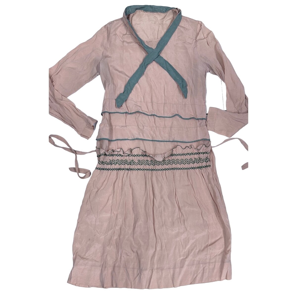 Antique 1920s pongee silk dress in soft peach with subtle green accent trims, designed with long sleeves, tie-neck detail, and snap closures at the cuffs. A beautiful example of 1920s daywear construction.