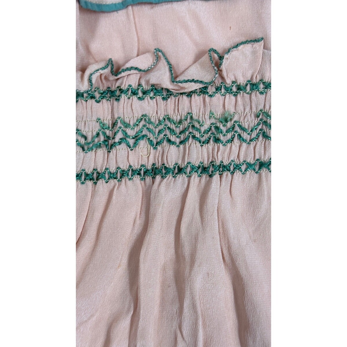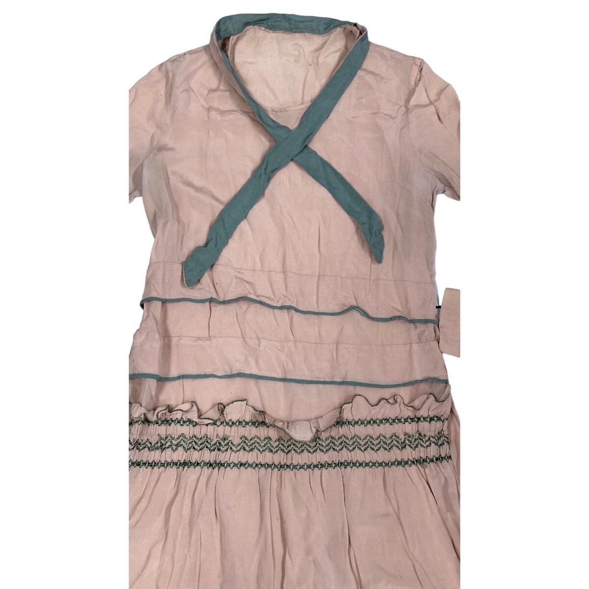 Antique 20s Peach Pongee Silk Dress Green Accent Trim Damaged Costume Parts XS