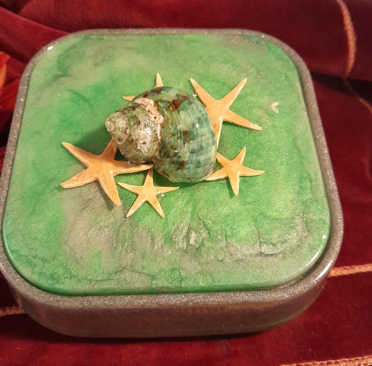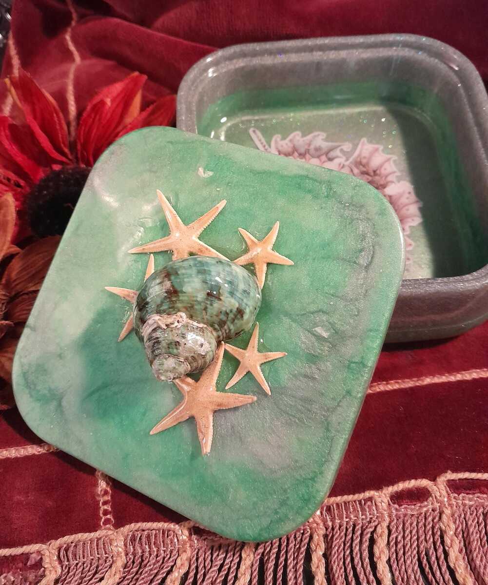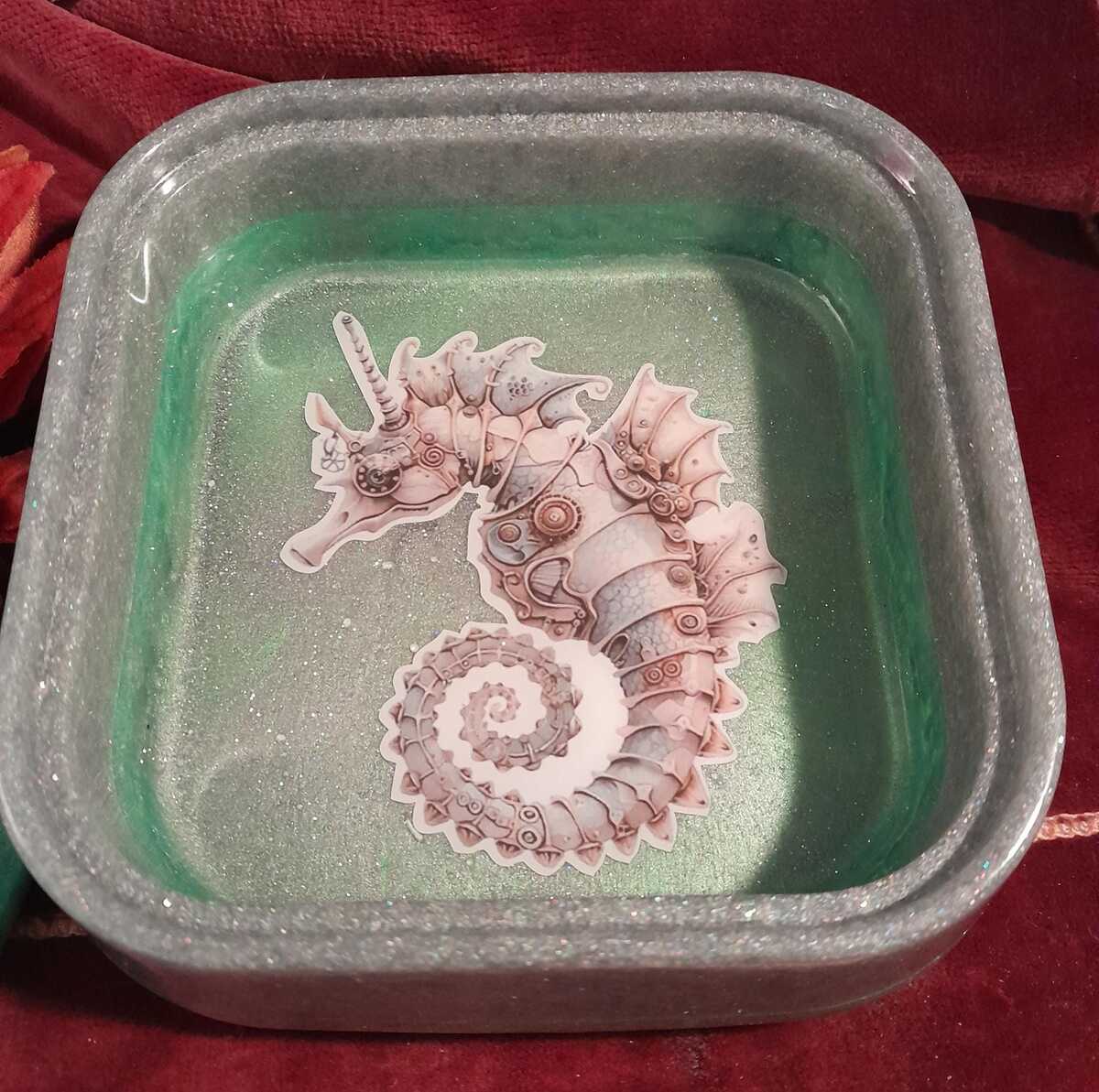 This Beach themed resin Jewelry Box Trinket Dish is very cool. Resined on the inside is a very cool decal of a Steampunk Unicorn Seahorse. I didn't know they even existed. ;-) Cute for all sorts of trinkets and treasures.