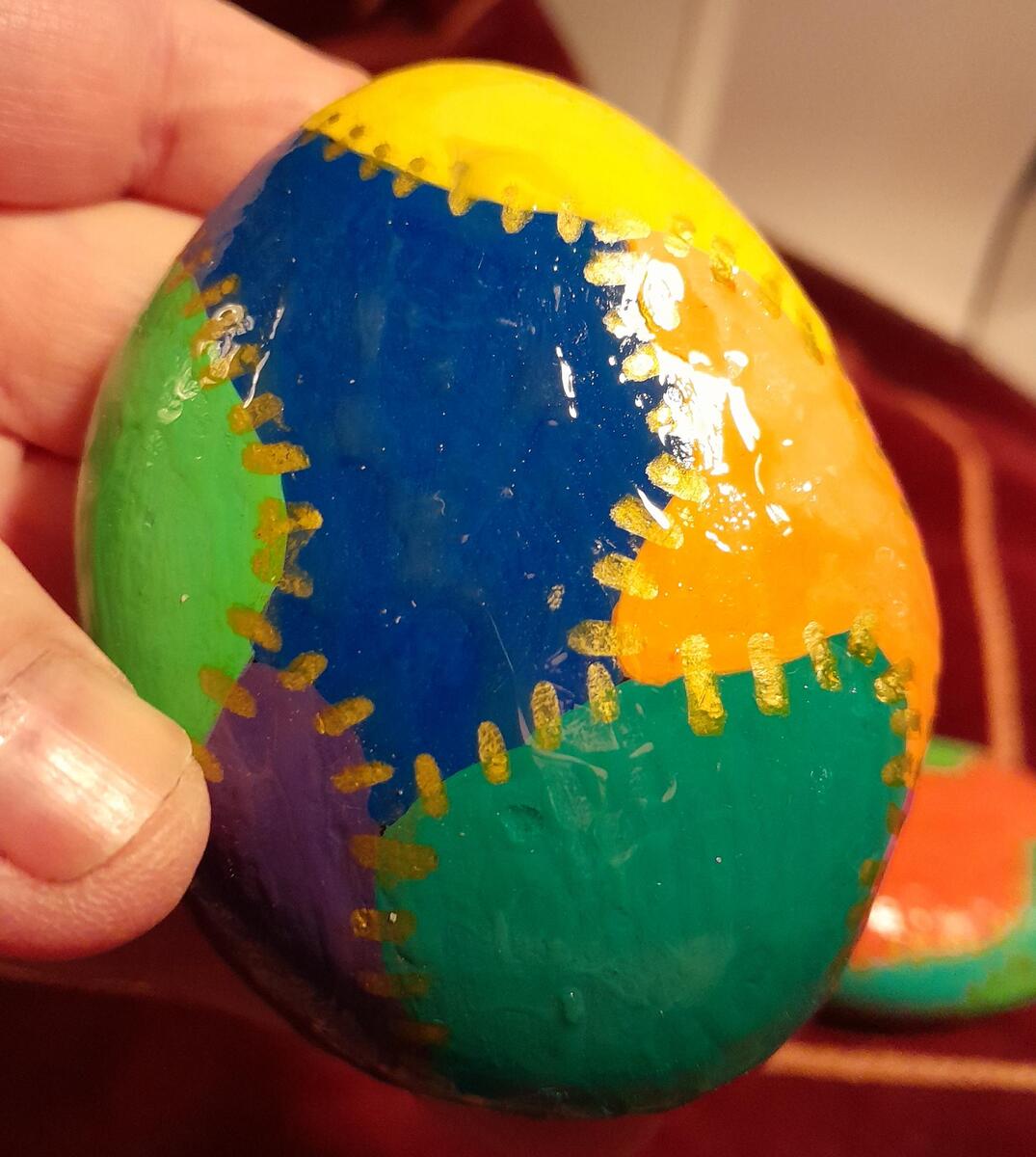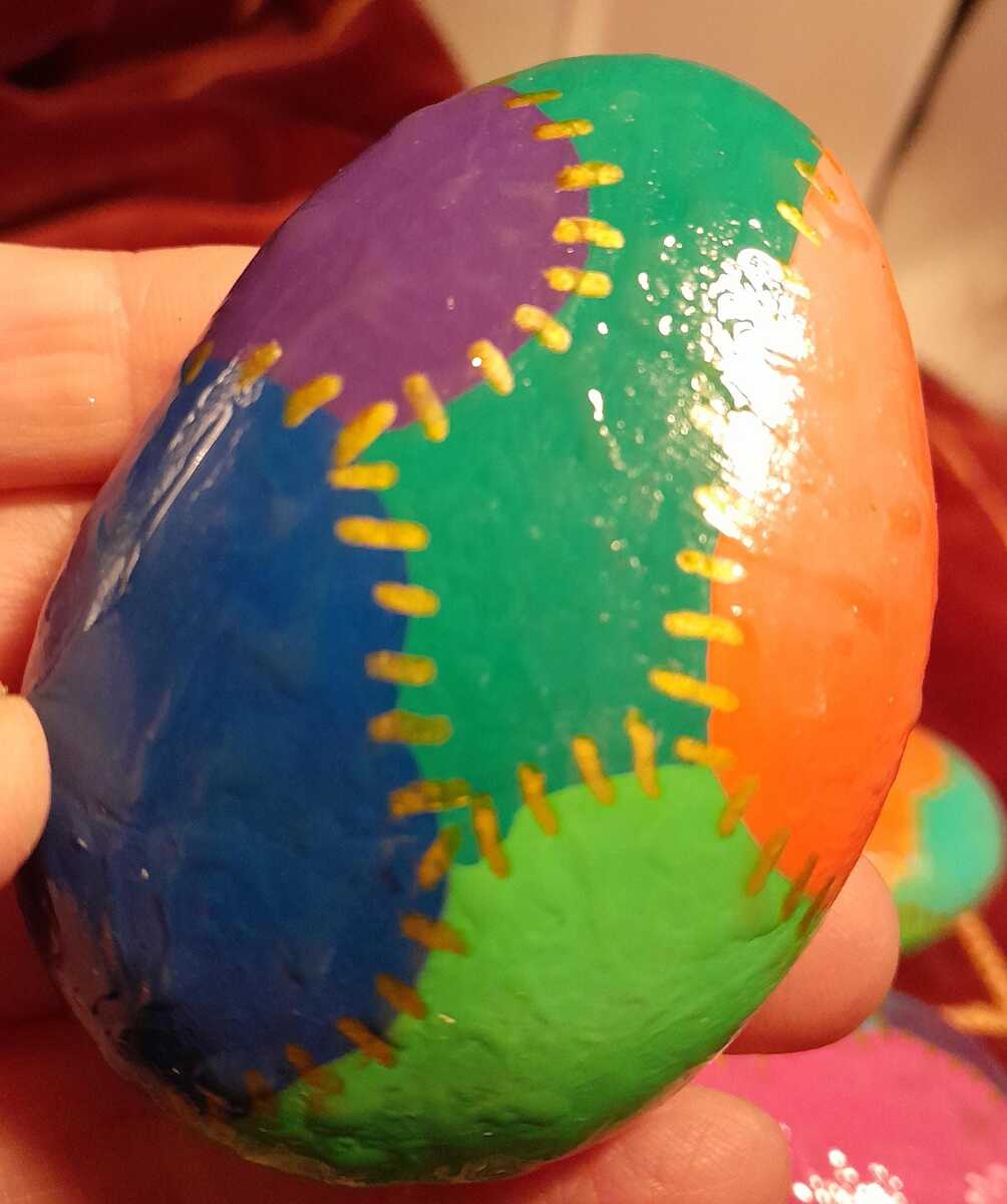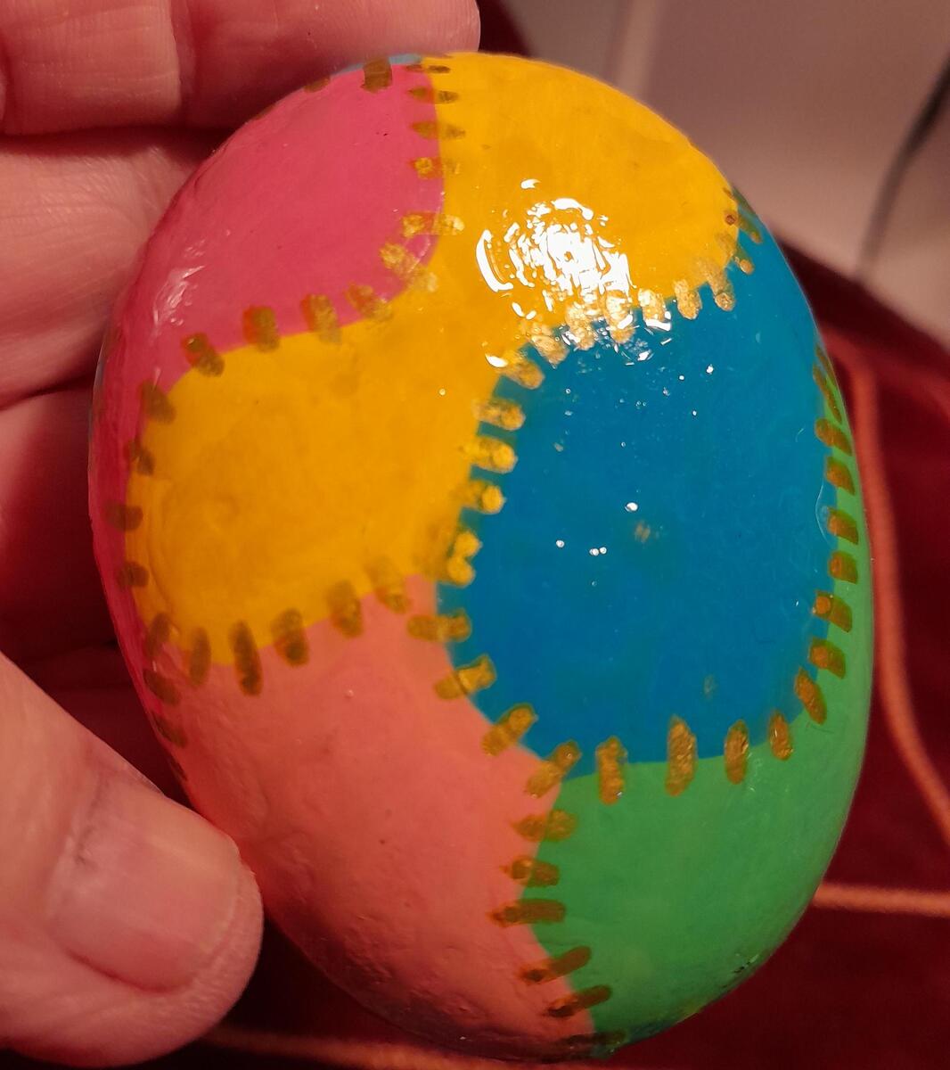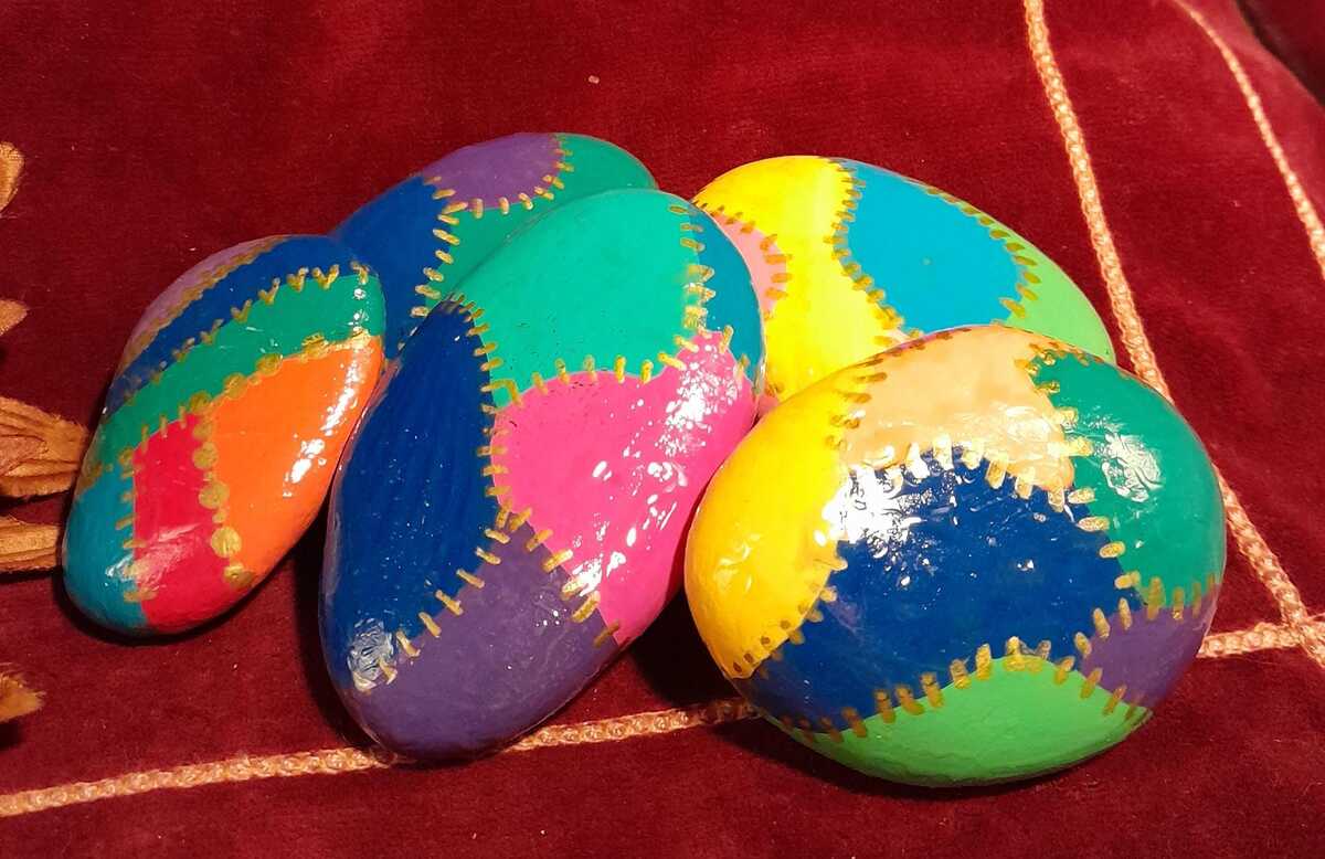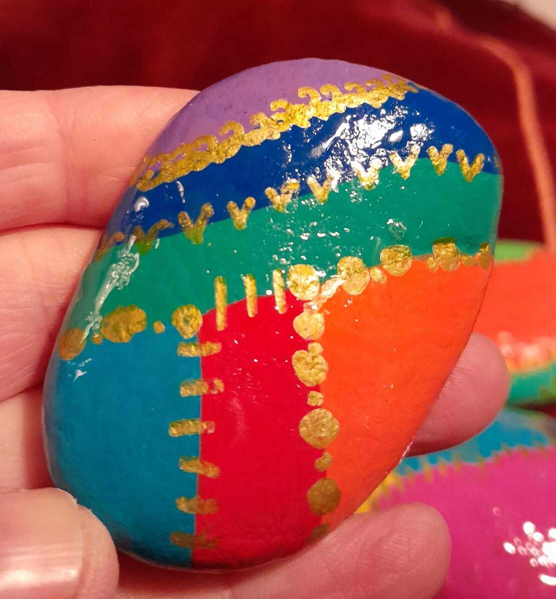 This is a truly one of a kind set of handpainted Rocks. This Set of 5 are painted on all sides and decorated with bright colors and accented with gold stripes to imitate the vintage boho feel of patchwork.