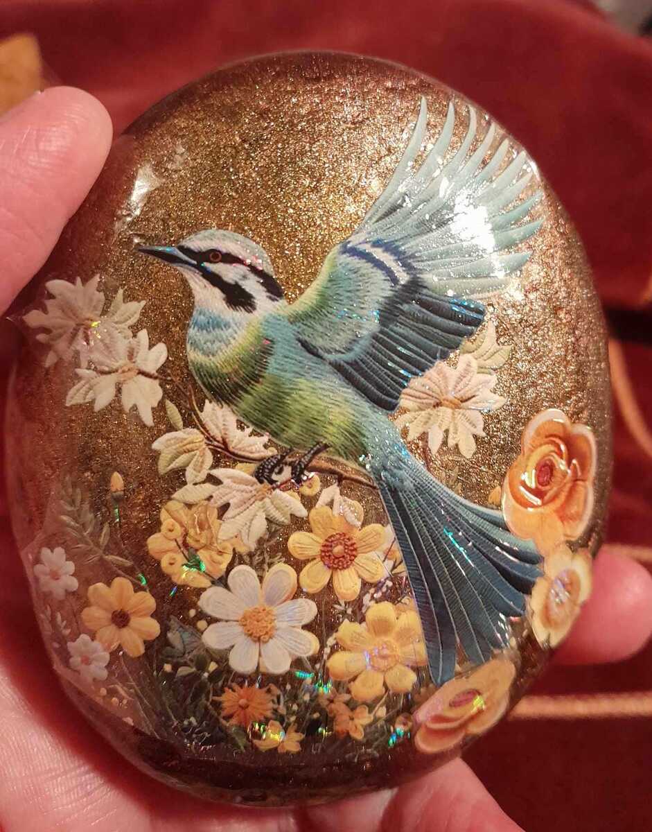 Spectral Bird & Flowers Mixed Media Rock Paperweight Desk Decor Gift Basket Coll