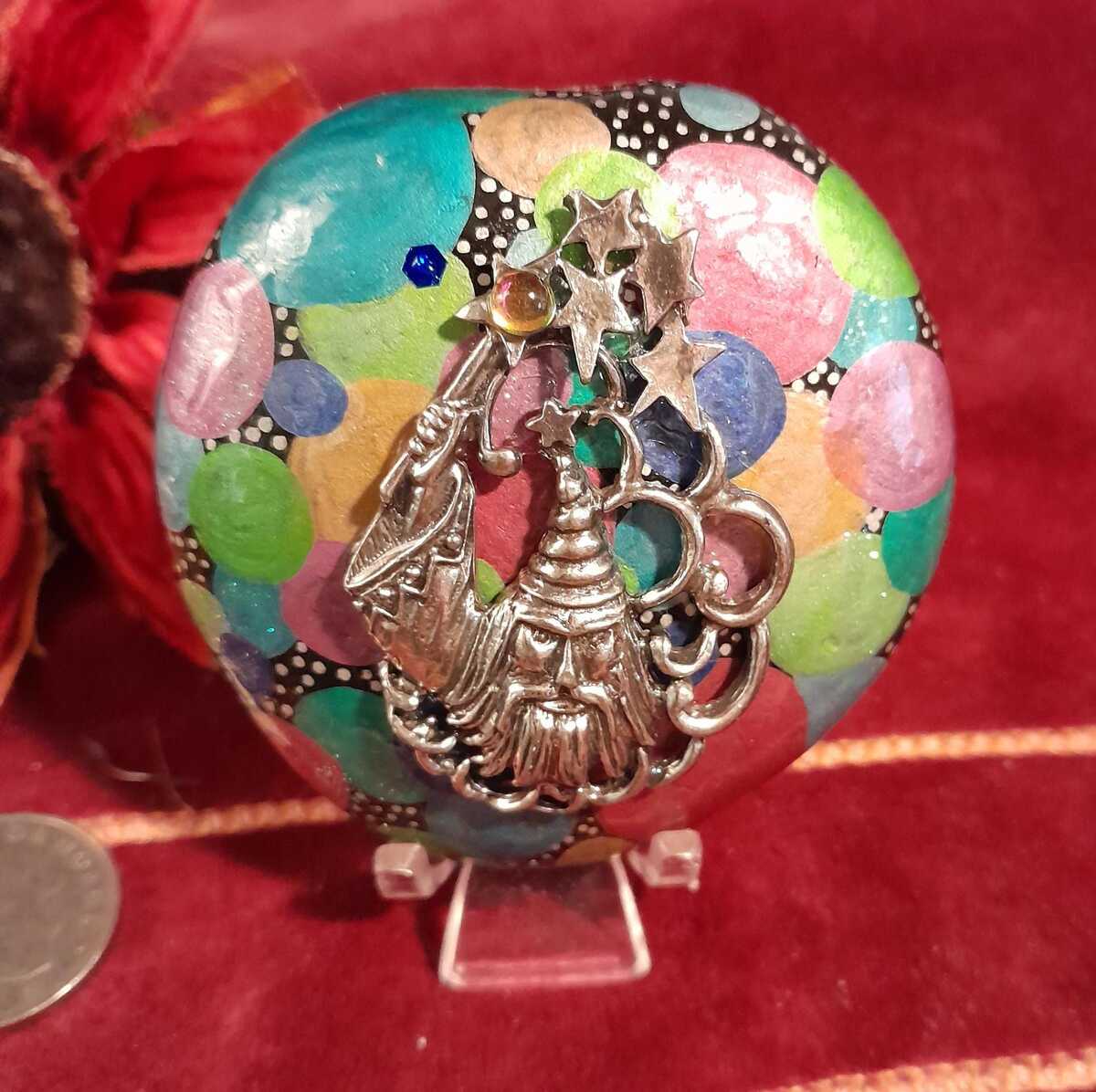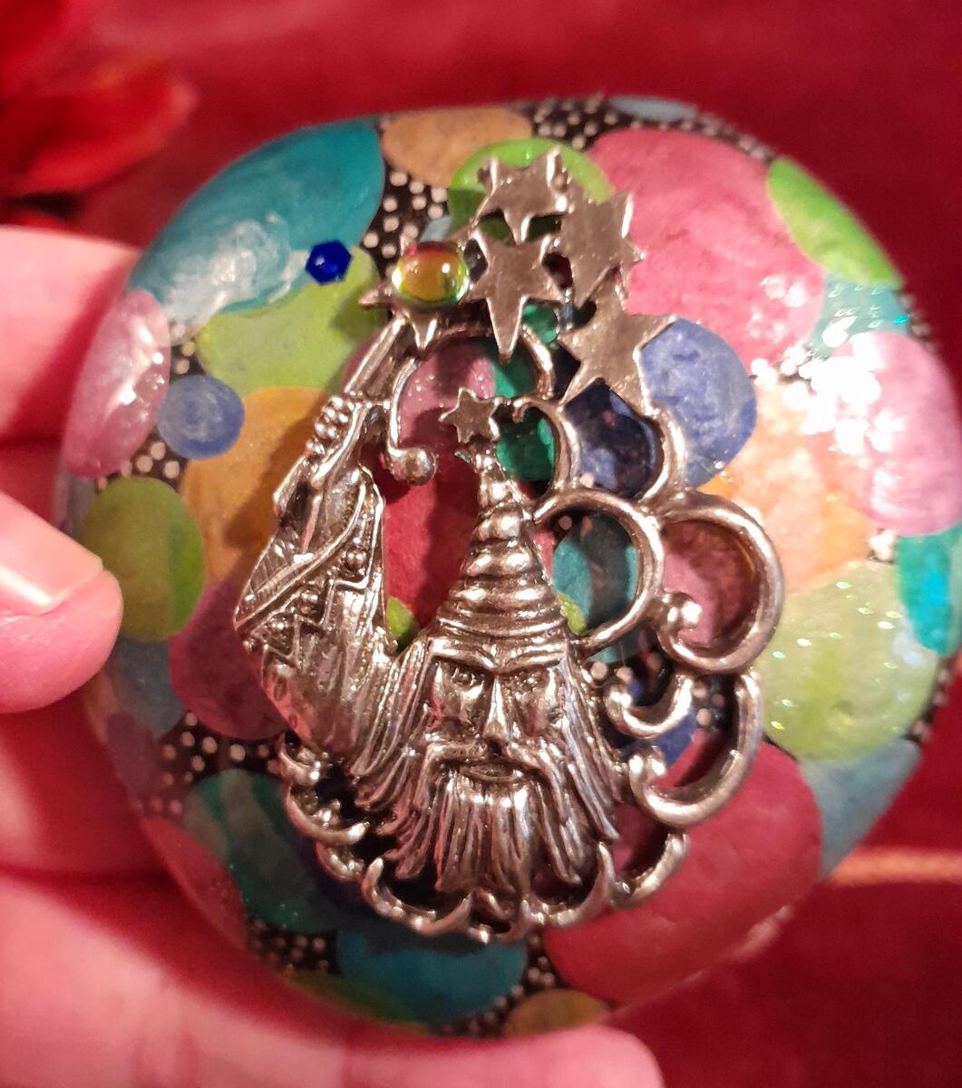 I watercolored the backdrop on this natural rock with different circles of colors, white dots and black background. Then I placed the wonderful and magical Merlin the Wizard front and center. He is here to give whatever space he inhabits a touch of wonder and magic.