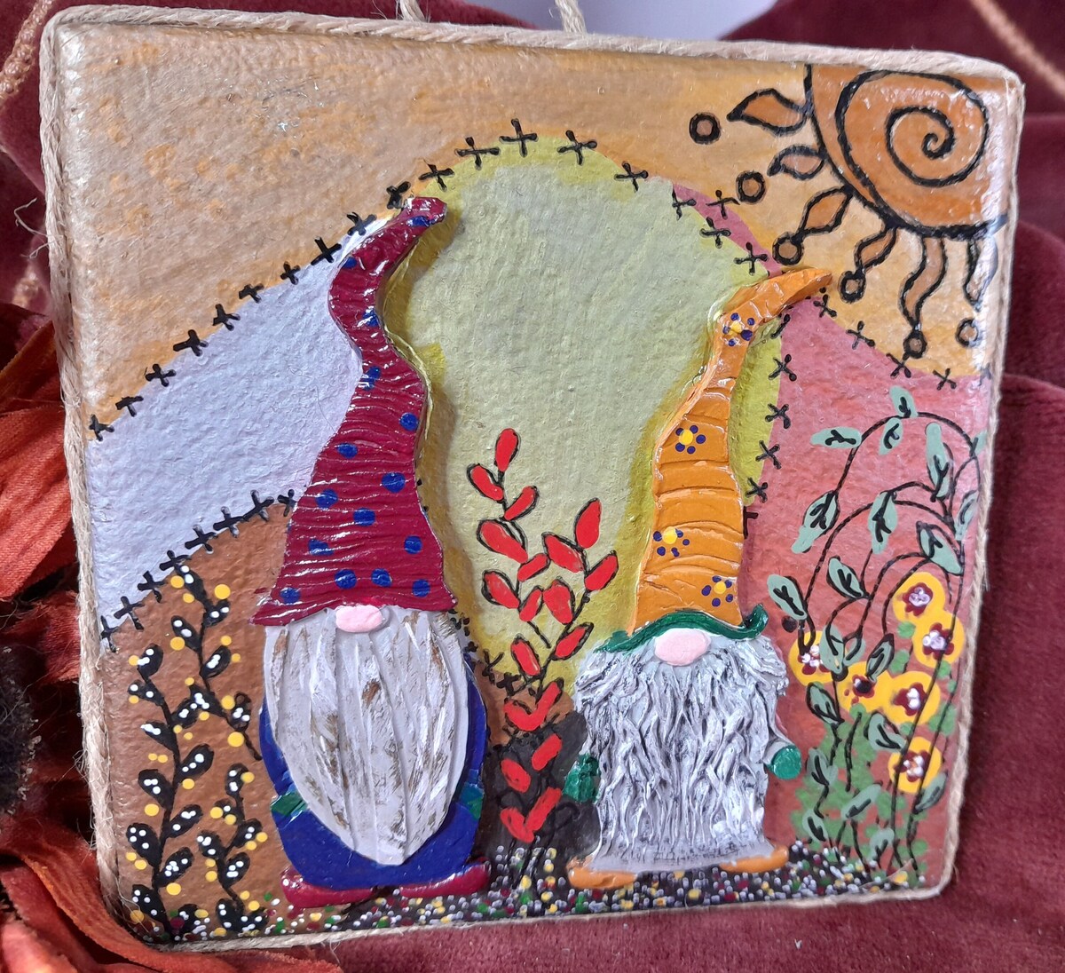 Fall Friends Gnomes Hand Painted Mixed Media Ceramic Tile Decor Unique Gifts Uni