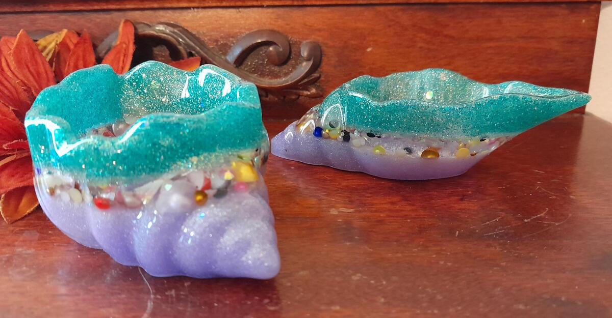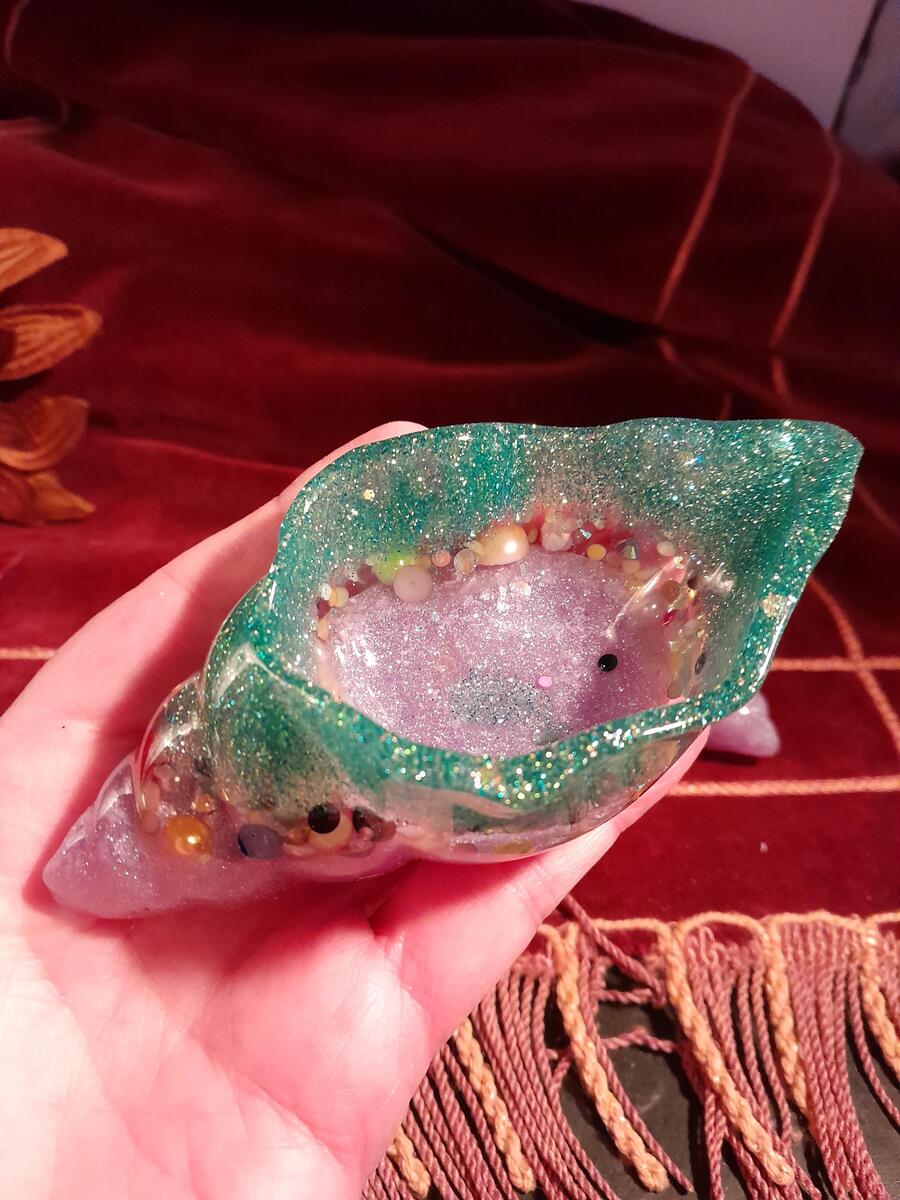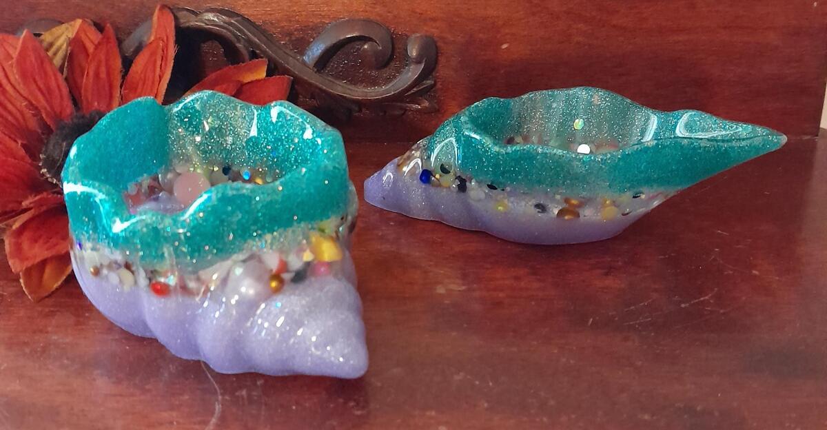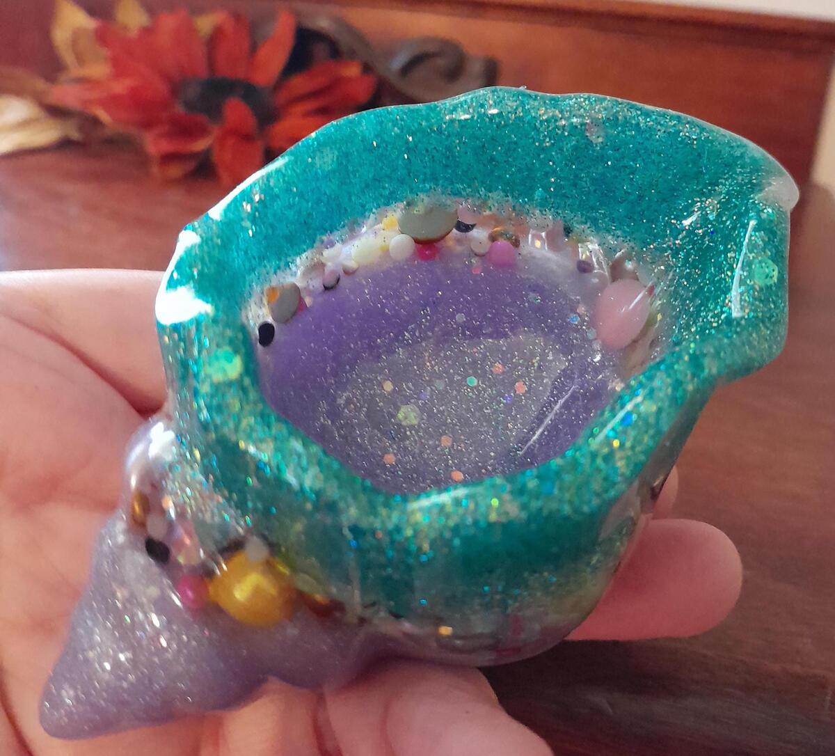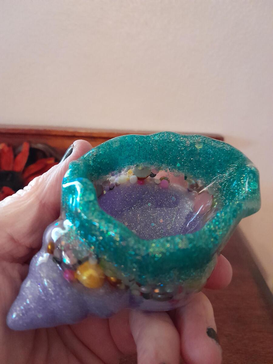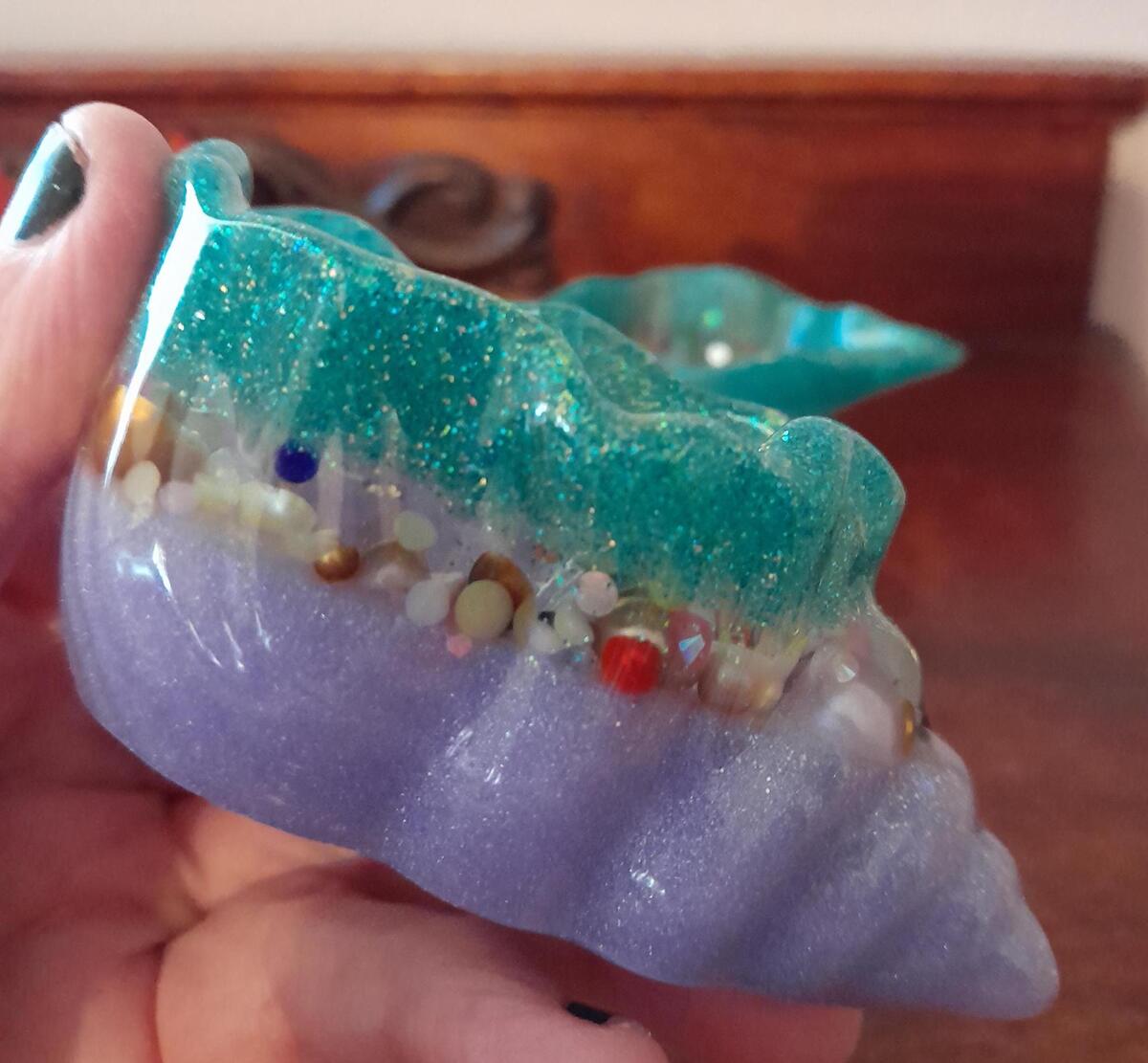 These little shell planter pots are just all the rage right now. These are layered, which means the process of making them was long, but results in pieces that are completely unique to anything else. Glittery, smooth, colored pebbles and beads, it's got it all.
