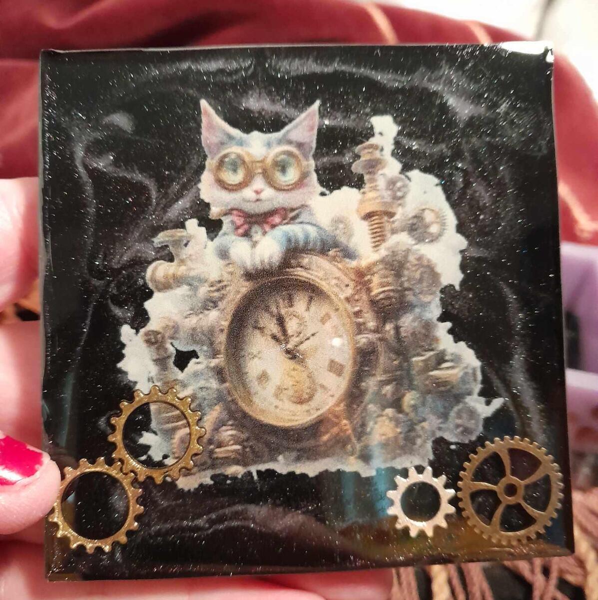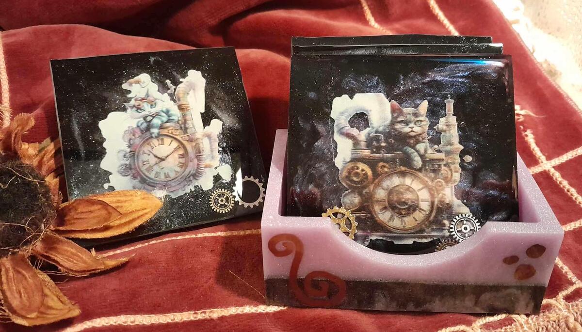 Coaster SET of 4 and Holder STEAMPUNK CATS and similar items