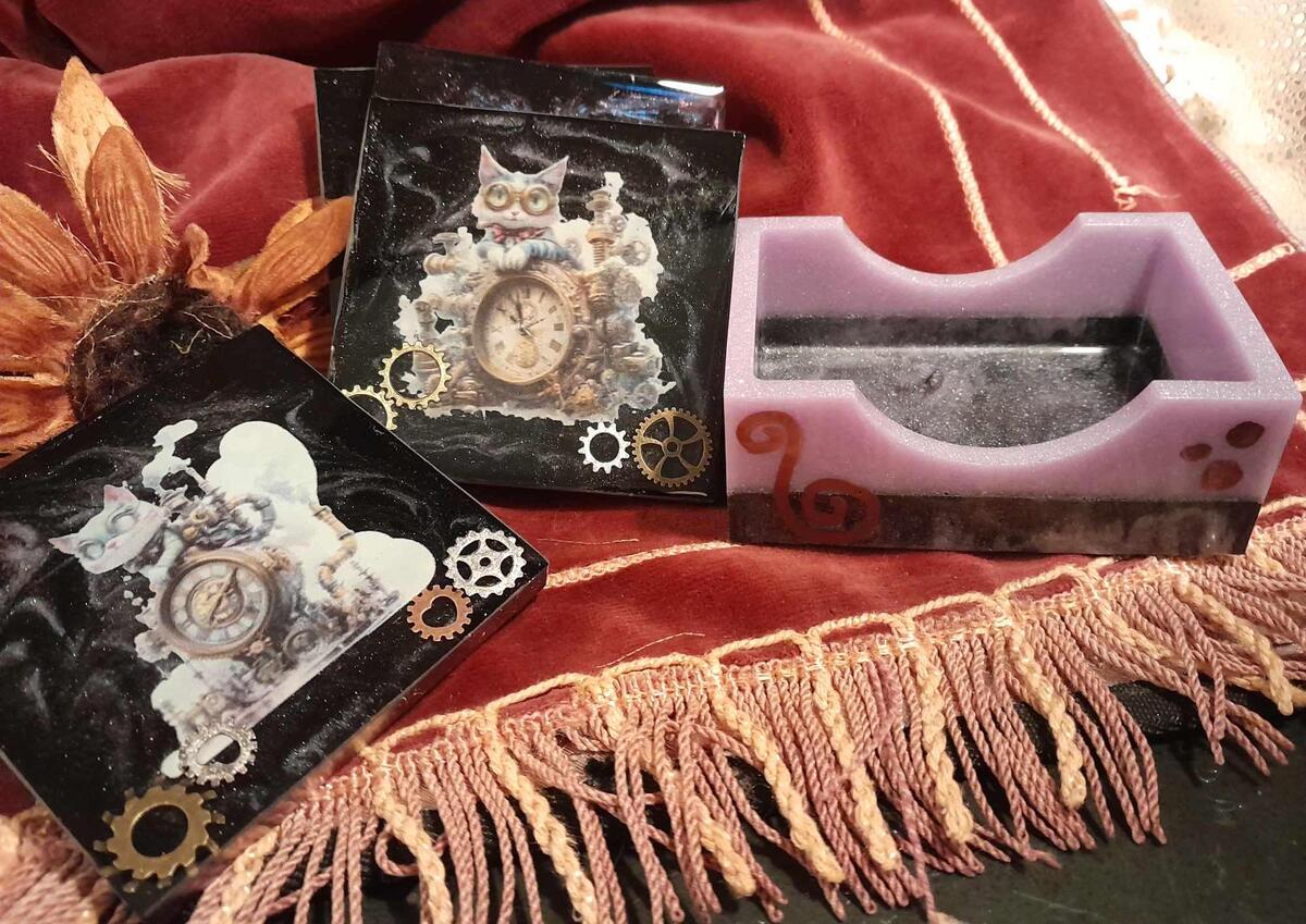 Coaster SET of 4 and Holder STEAMPUNK CATS Unique Mixed Media Gifts Handmade Gif