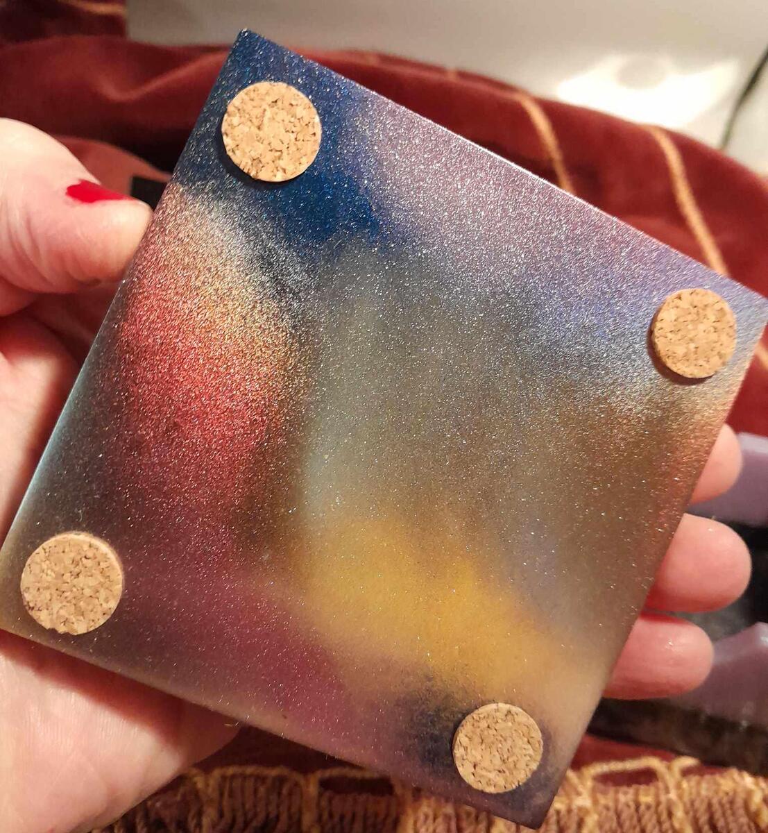 Backs of Coaster are very cooly colored and have cork footings to protect your furniture. The matching Holder also has cork footing. VERY nice and unique for gifting.