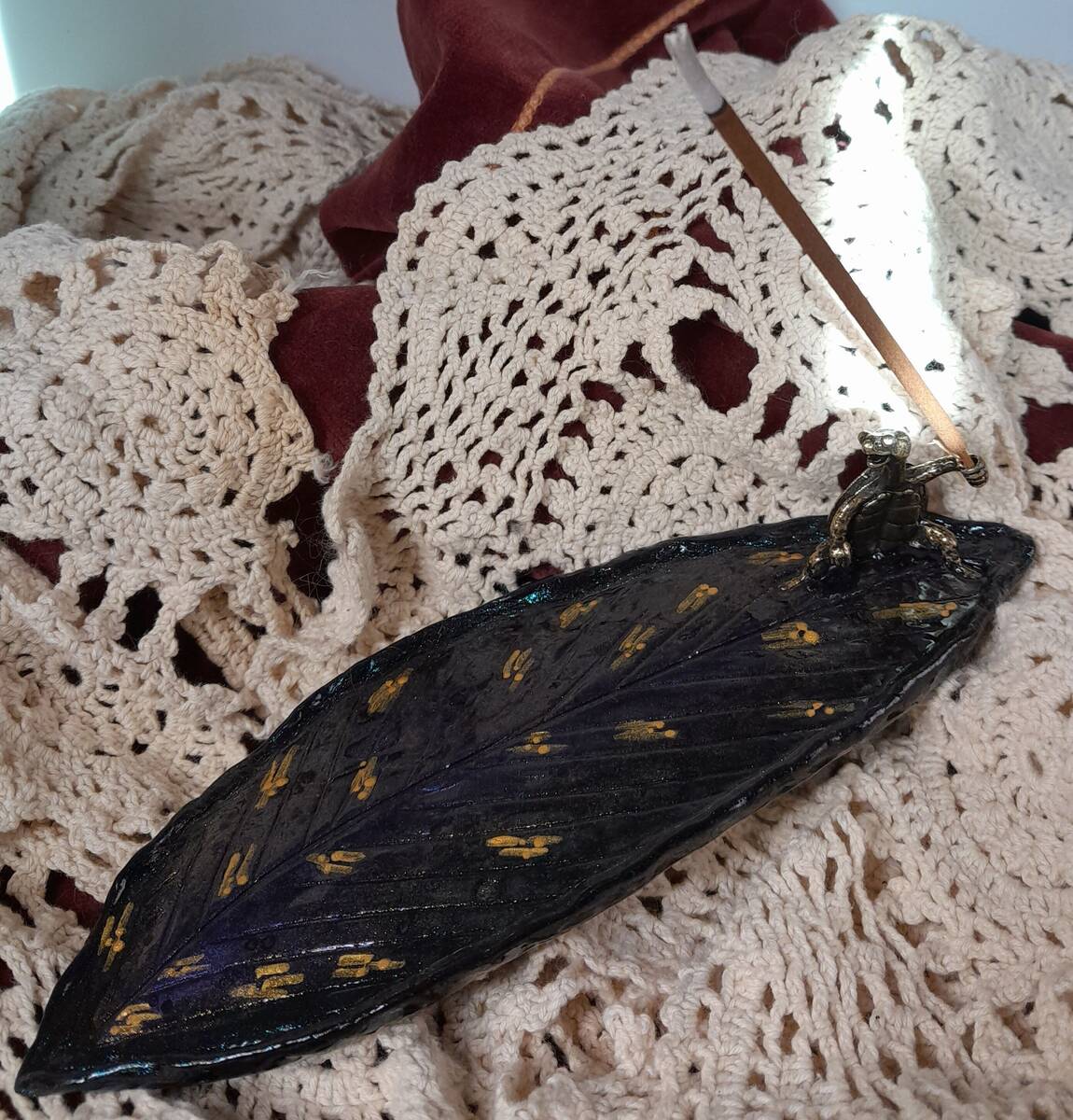 This cool Turtle dude holds your incense stick while doing his Ninja Surfer impression. Decorated with watercolor glitter pigments, gold accents and sealed in resin.