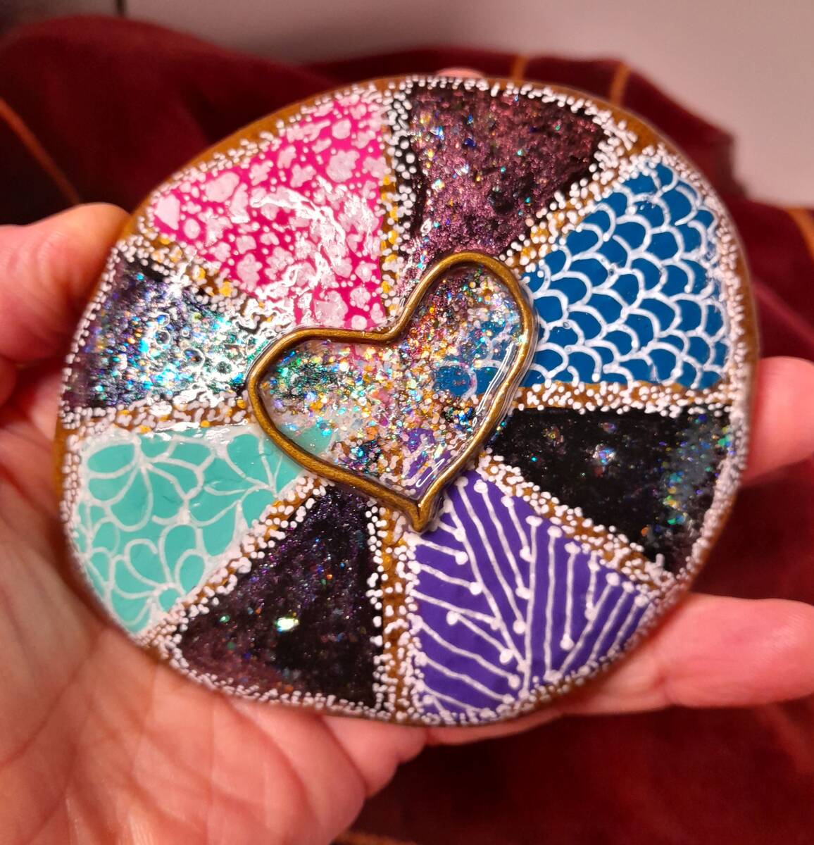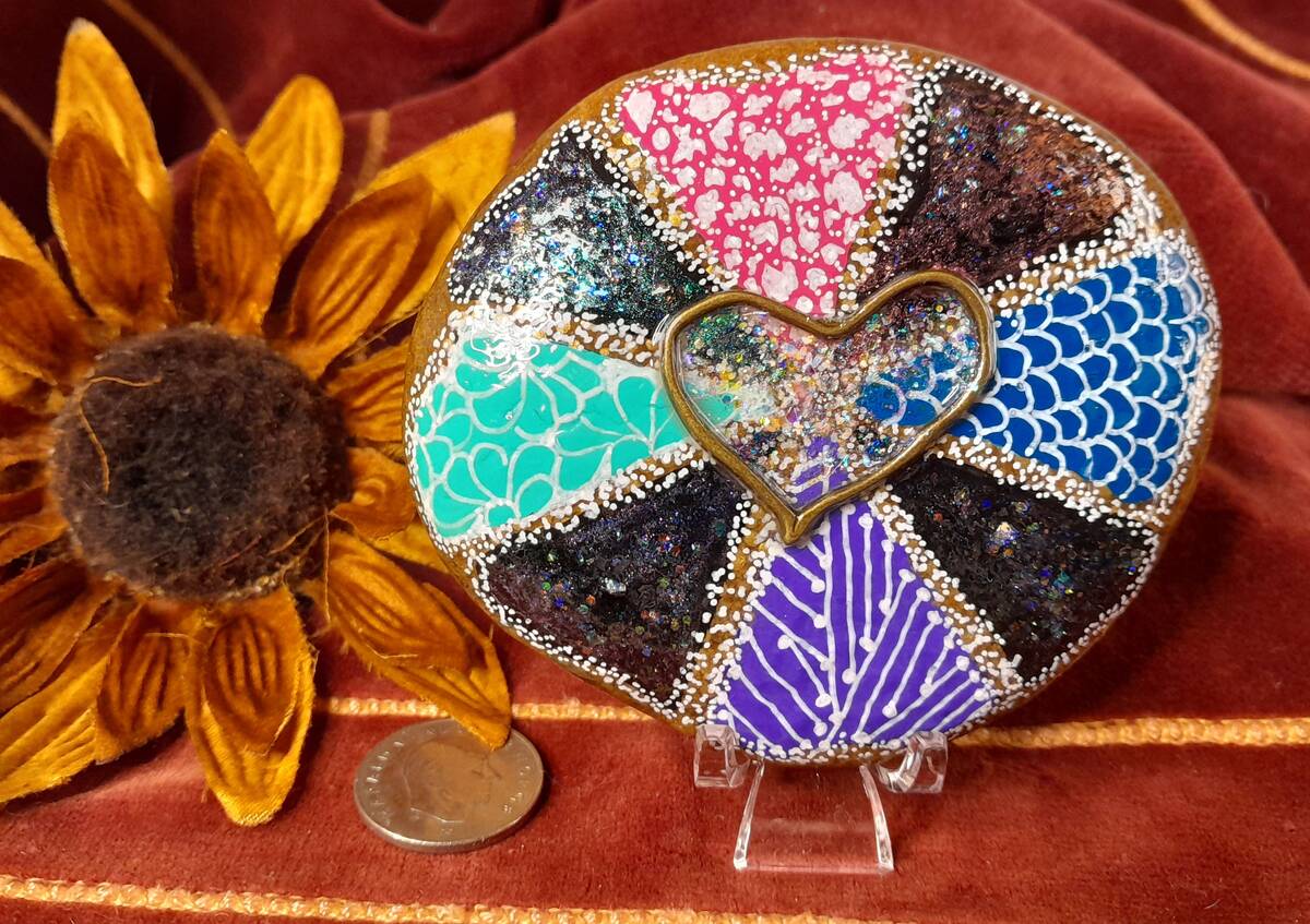 I took a nice Rock and painted it in sections with colors and squiggles, then added an antique bronze metal Heart to the center, and filled it with chunky holographic glitter. There's glitter accents on some of the sections as well. An attention getter for sure!