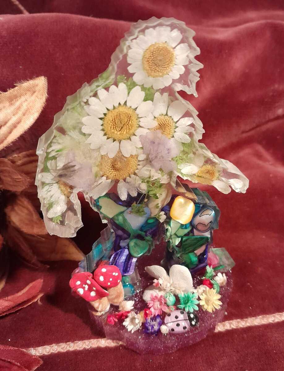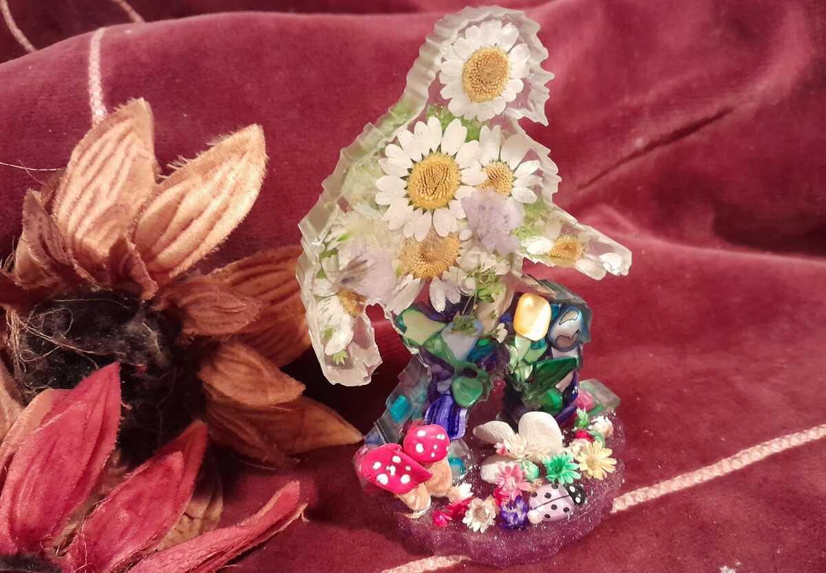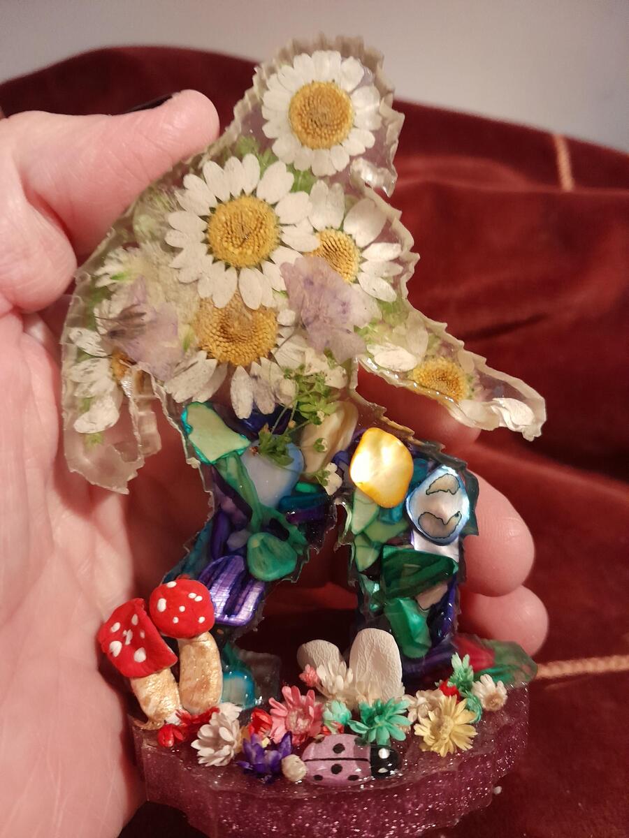 This guy was fun to make. He's filled with crushed shells in his feet and legs, clay mushrooms... and the rest is filled with Wildflowers. Symbolizes his relationship with the Great Outdoors.