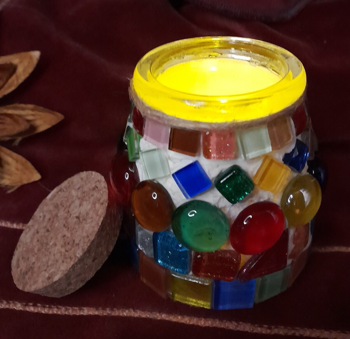 This small mosaic glass jar is handmade with love. Perfect for a tea light candle holder. Casts a warm cozy glow to a small space. Can also use for dry storage, pen holder, coins, potpourri, etc.