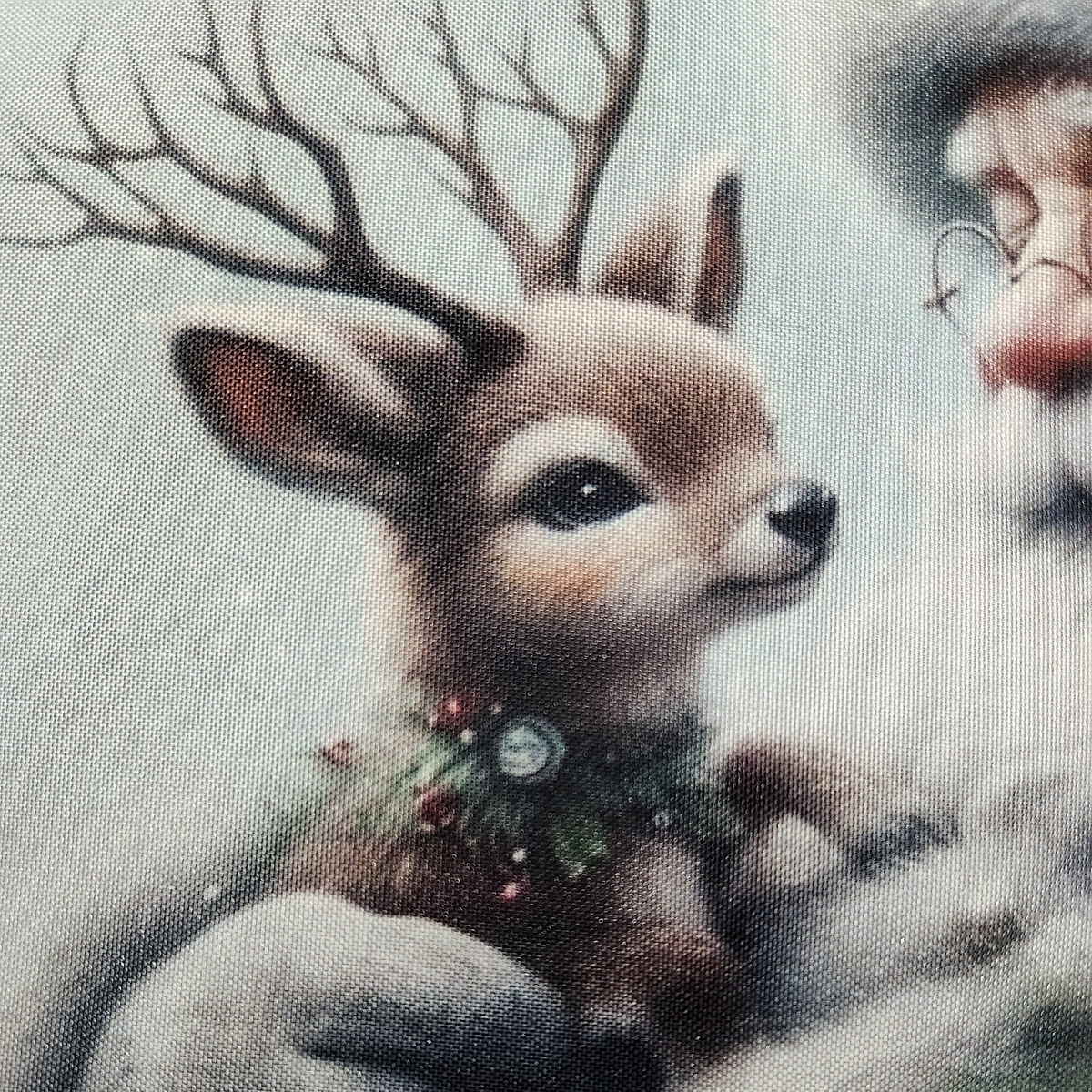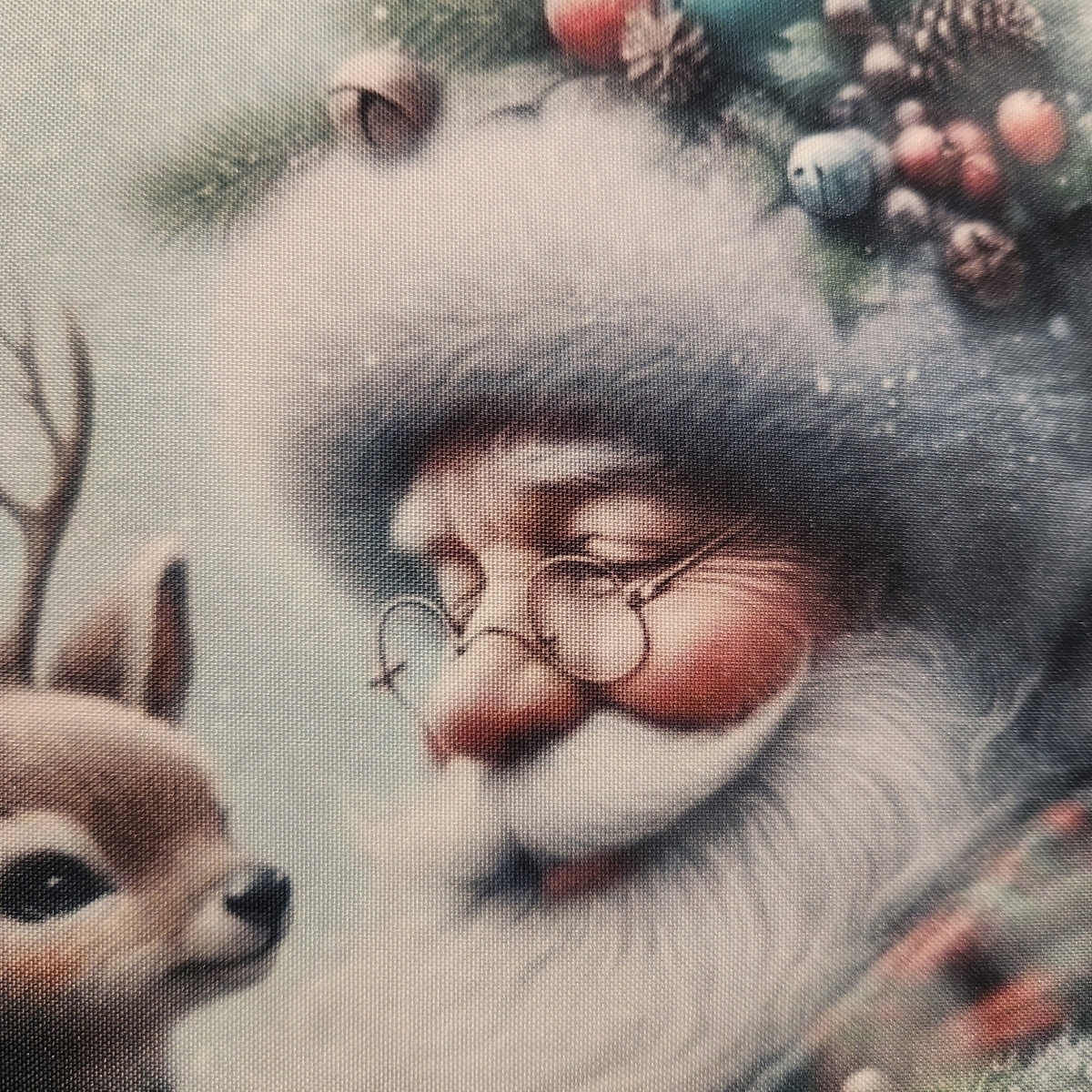 A decorative Christmas pillow features a portrait of Santa wearing colorful bells and holding a young deer i dyed into the fabric of this pillow cover. The pillow is a square fluffy pillow available in 2 sizes. The pillow cover is 100% white polyester. it has a zipper on the bottom so the pillow can be removed. The cover is washable and the pillow also has a zippered cover than can be removed and washed. The design is dyed into the fabric so it resists fading. There is no rough or textured feel to the design like in vinyl or iron on transfer designs.