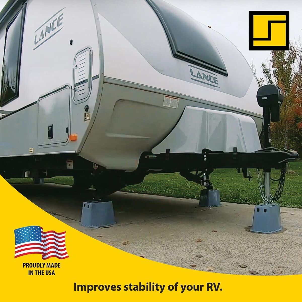 STACKABLE: These RV leveling blocks are unique trailer accessories that can be stacked to make them as high as 14 quote; tall and have a 3000-pound capacity. Our RV accessories for travel trailers are easy to install and can work in any type of terrain.