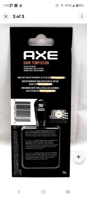 The AXE Air Freshener Mini Vent Clip is a dark temptation scent odor eliminator designed by the brand AXE. This product is specifically made to be installed in a vehicle vent area, providing a convenient and efficient way to eliminate odors and freshen the air with a enticing aroma. Perfect for keeping your car smelling great and making your daily commute more enjoyable.