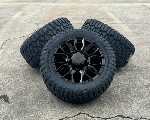 New Set Of Four GM Style Replica 20" 8 lug (8-180 bolt pattern) Gloss Black Ultimate Wheels With Blackhawk Ridgecrawler R/T 33x12.50R20 Tires for 2011-2025 Chevy Silverado 2500 or 3500 and Suburban 2500.